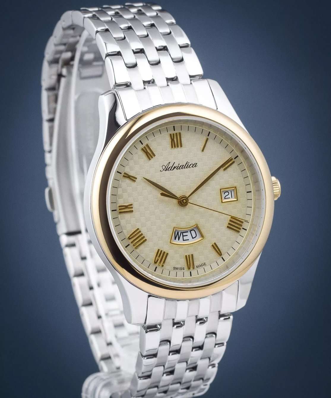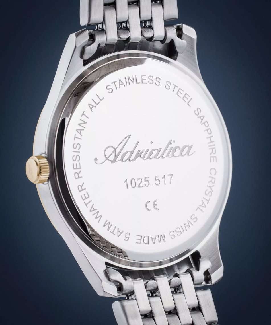 Часы Adriatica A1025.2161Q представляют собой идеальное сочетание элегантности и функциональности, разработанное для современных мужчин. Их стильный циферблат защищен сапфировым стекломСапфировое стеклоПрочный и надёжный материал из кристалла сапфира синтетического происхождения, характеризующийся особой твёрдостью и устойчивостью к царапинам и повреждениям., что придает дополнительную устойчивость к царапинам. Корпус из нержавеющей стали подчеркивает их изысканность и долговечность. Надежный кварцевый механизм с калибром RONDA 517 гарантирует точность времени, а водозащита WR 50 (5 ATM) обеспечивает защиту от воды в различных условиях. Браслет из нержавеющей стали с раскладной застёжкойРаскладная застёжкаТакой тип застёжки используется только на браслетах из металла. Она никогда не раскрывается полностью, происходит разделение на 2 и более частей. Раскладывающая застёжка снизит вероятность потери часов к минимуму., гармонично дополняет общий дизайн и обеспечивает комфортное ношение на запястье. Окошко даты находится в положении 3 часа. День недели отображается в положении 6 часов. БезельБезельВнешний ободок, закрепляющий стекло. В спортивных часах так называется поворотное кольцо с делениями на циферблате, выполняет роль таймера – замеряет отрезки времени на шкале. Неподвижный безель – элемент декора. Однонаправленно вращающийся безель на дайверских часах позволяет фиксировать моменты погружения и выныривания на поверхность. с PVD-покрытиемPVDУльтратонкое покрытие наносится в технике вакуумного напыления, сочетает в себе нитрид титана особой прочности со слоем золота или оксида хрома. Несёт в себе декоративную или защитную функцию..