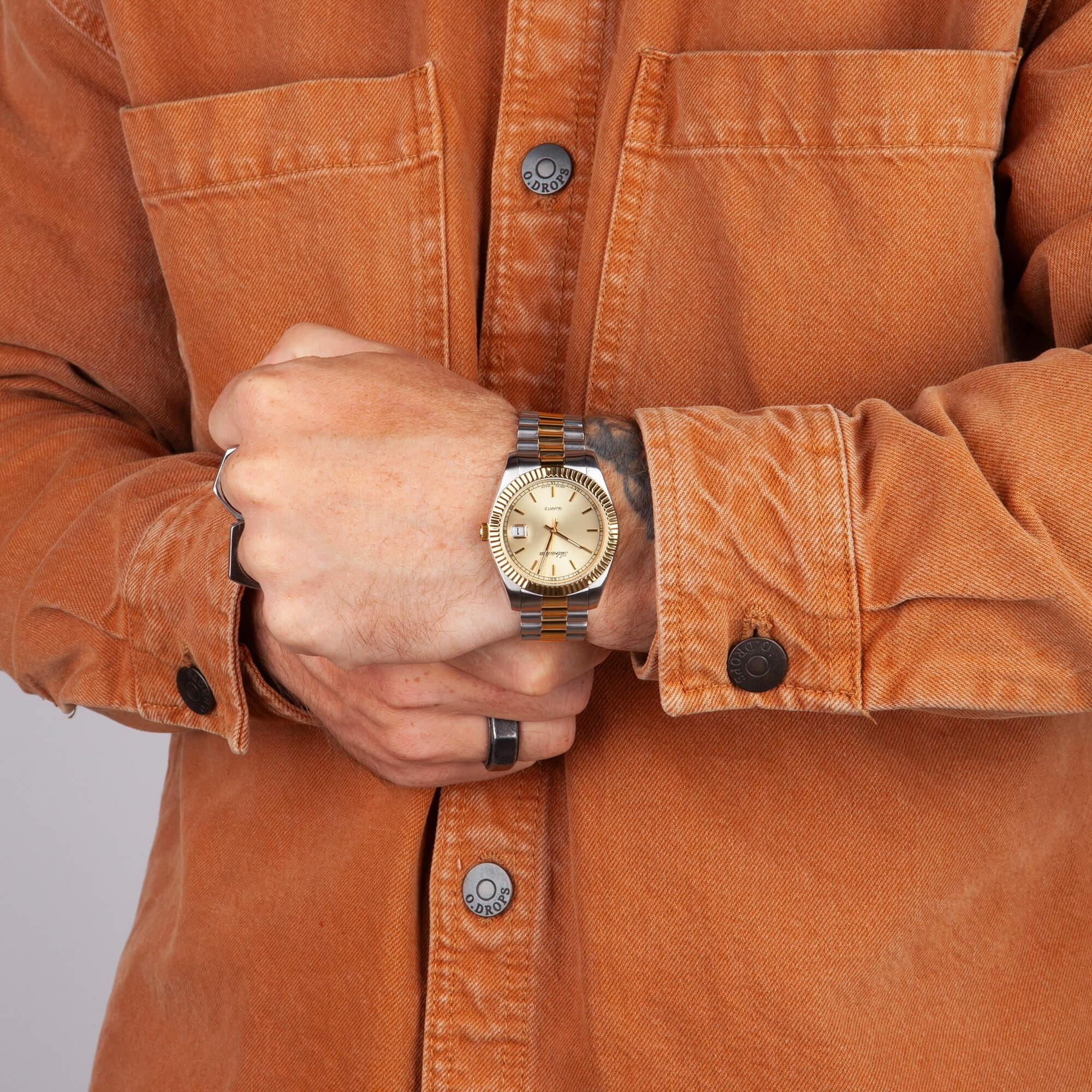 Часы Adriatica A1090.2111Q воплощают в себе классический стиль и надежность, идеально подходящие для современных мужчин. Их золотистый циферблат, защищенный минеральным стекломМинеральное стеклоМинеральное стекло представляет собой искусственно выращенный минерал кварца. Такое стекло отличается особой устойчивостью к повреждениям и царапинам. Уступает по некоторым качествам сапфировому стеклу., заключен в корпус из прочной нержавеющей стали, а их безельБезельВнешний ободок, закрепляющий стекло. В спортивных часах так называется поворотное кольцо с делениями на циферблате, выполняет роль таймера – замеряет отрезки времени на шкале. Неподвижный безель – элемент декора. Однонаправленно вращающийся безель на дайверских часах позволяет фиксировать моменты погружения и выныривания на поверхность. золотистого цвета с PVDPVDУльтратонкое покрытие наносится в технике вакуумного напыления, сочетает в себе нитрид титана особой прочности со слоем золота или оксида хрома. Несёт в себе декоративную или защитную функцию. покрытием. Надежный кварцевый механизм с калибром RONDA 515 обеспечивает точность, а водозащита уровня WR 50 (5 ATM) делает их устойчивыми к воздействию воды. Стальной браслет с частичным PVDPVDУльтратонкое покрытие наносится в технике вакуумного напыления, сочетает в себе нитрид титана особой прочности со слоем золота или оксида хрома. Несёт в себе декоративную или защитную функцию. покрытием и раскладной застёжкойРаскладная застёжкаТакой тип застёжки используется только на браслетах из металла. Она никогда не раскрывается полностью, происходит разделение на 2 и более частей. Раскладывающая застёжка снизит вероятность потери часов к минимуму. подчеркивает элегантный стиль и комфортно сидит на запястье. Часы оснащены функцией отображения даты в окошке в положении 3 часа, что добавляет практичности в повседневной жизни. Люминесцентное покрытиеЛюминесцентное покрытиеПозволяет считывать показания времени в темноте. Производители наносят на стрелки, часовые индексы, безель или поверхность циферблата светонакопительный состав, дающий холодное свечение. на стрелках и метках обеспечивает отличную видимость в темноте.