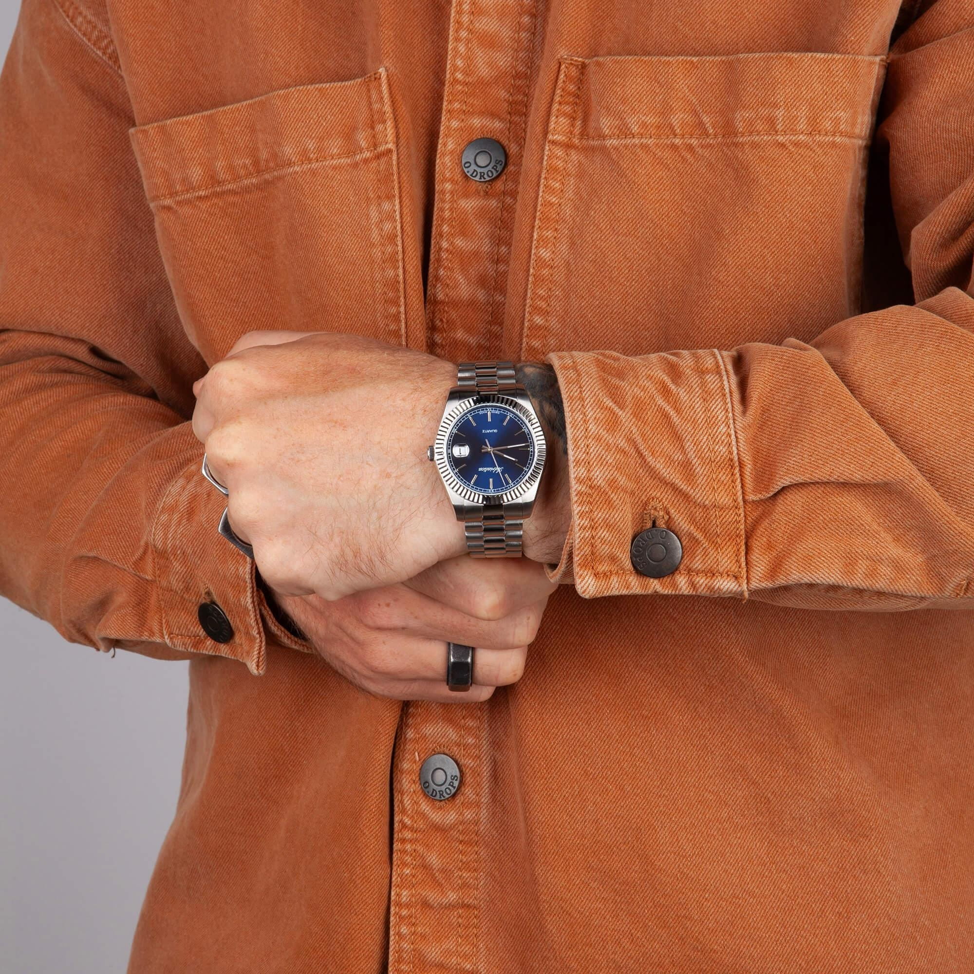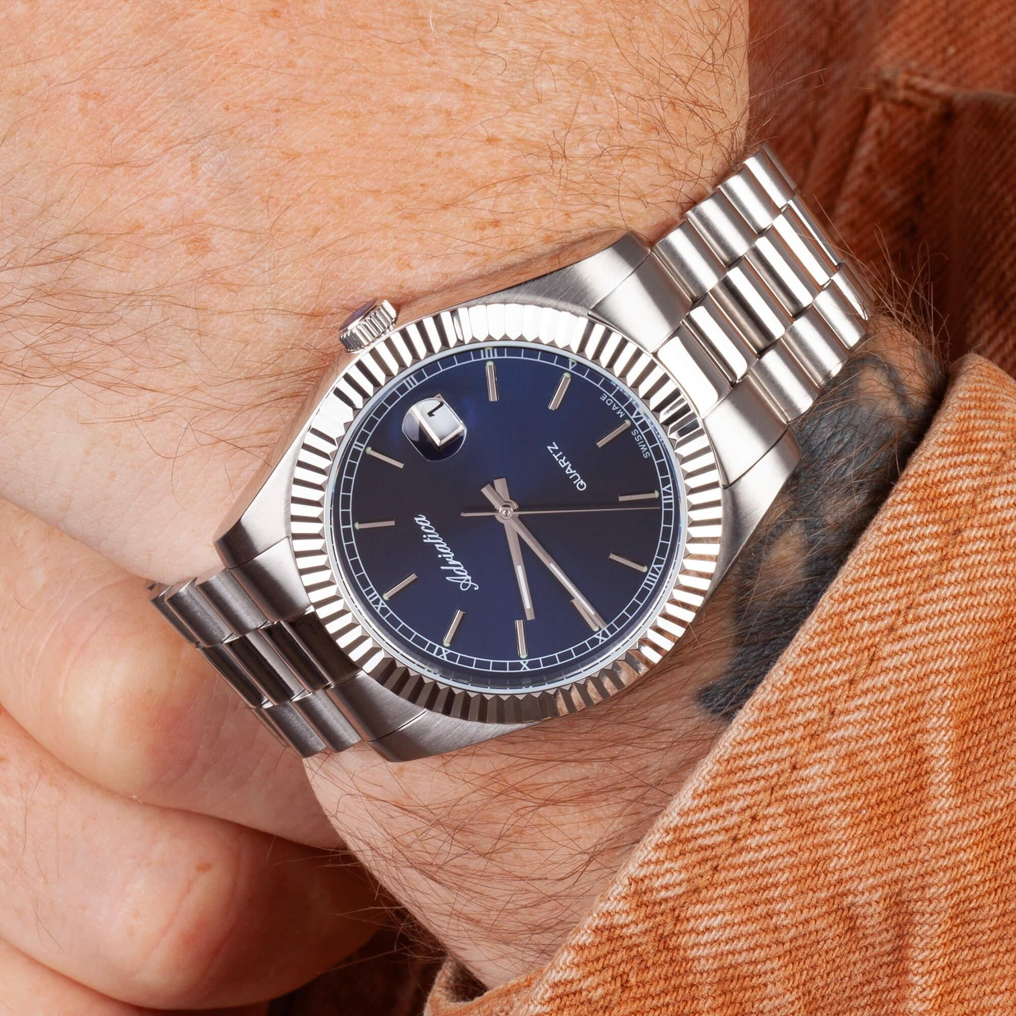 Часы Adriatica A1090.5115Q воплощают в себе классический стиль и надежность, идеально подходящие для современных мужчин. Их синий циферблат, защищенный минеральным стекломМинеральное стеклоМинеральное стекло представляет собой искусственно выращенный минерал кварца. Такое стекло отличается особой устойчивостью к повреждениям и царапинам. Уступает по некоторым качествам сапфировому стеклу., заключен в корпус из прочной нержавеющей стали. Надежный кварцевый механизм с калибром RONDA 515 обеспечивает точность, а водозащита уровня WR 50 (5 ATM) делает их устойчивыми к воздействию воды. Стальной браслет с раскладной застёжкойРаскладная застёжкаТакой тип застёжки используется только на браслетах из металла. Она никогда не раскрывается полностью, происходит разделение на 2 и более частей. Раскладывающая застёжка снизит вероятность потери часов к минимуму. подчеркивает элегантный стиль и комфортно сидит на запястье. Часы оснащены функцией отображения даты в окошке в положении 3 часа, что добавляет практичности в повседневной жизни. Люминесцентное покрытиеЛюминесцентное покрытиеПозволяет считывать показания времени в темноте. Производители наносят на стрелки, часовые индексы, безель или поверхность циферблата светонакопительный состав, дающий холодное свечение. на стрелках и метках обеспечивает отличную видимость в темноте.