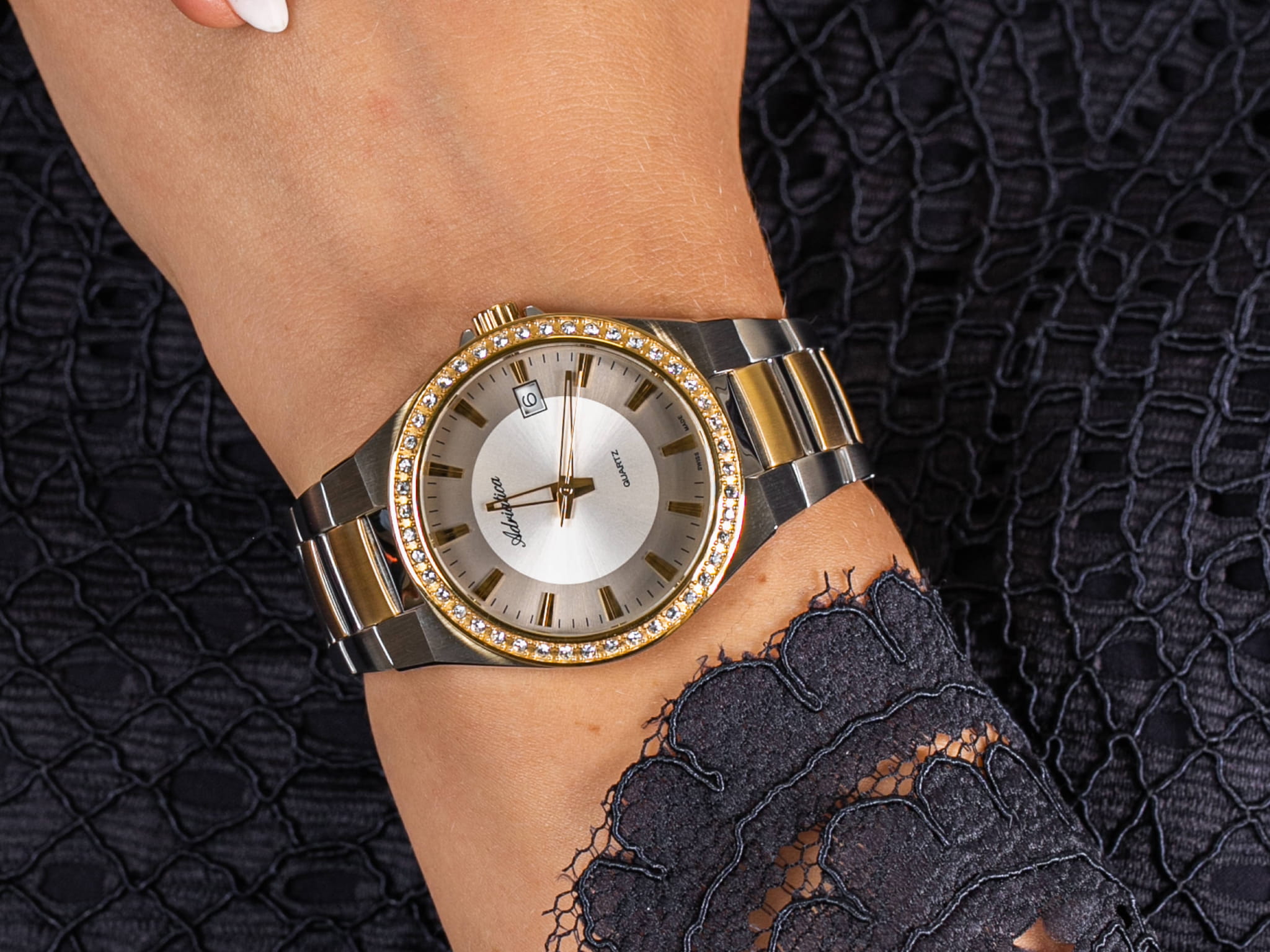 Женские швейцарские часы с минеральным стекломМинеральное стеклоМинеральное стекло представляет собой искусственно выращенный минерал кварца. Такое стекло отличается особой устойчивостью к повреждениям и царапинам. Уступает по некоторым качествам сапфировому стеклу. Adriatica A3804.2113QZ, кварцевый механизм Ronda 515, работающим от батарейки с высокой точностью.Класс водозащиты: 50 метров, позволит защитить корпус от случайных брызг или капель дождя. Корпус и браслет часов изготовлен из стали с PVD-покрытиемIP-покрытиеМетод ионного напыления. Демонстрирует повышенную устойчивость к истиранию, окислению и химическим веществам. Под воздействием высокого давления и температуры около 1500°C молекулы металла надёжно соединяются с частицами корпуса часов..Окошко даты находится в положении 3 часа.Стальной браслет на раскладной застёжкеРаскладная застёжкаТакой тип застёжки используется только на браслетах из металла. Она никогда не раскрывается полностью, происходит разделение на 2 и более частей. Раскладывающая застёжка снизит вероятность потери часов к минимуму.. Стрелки с люминесцентным покрытиемЛюминесцентное покрытиеПозволяет считывать показания времени в темноте. Производители наносят на стрелки, часовые индексы, безель или поверхность циферблата светонакопительный состав, дающий холодное свечение..БезельБезельВнешний ободок, закрепляющий стекло. В спортивных часах так называется поворотное кольцо с делениями на циферблате, выполняет роль таймера – замеряет отрезки времени на шкале. Неподвижный безель – элемент декора. Однонаправленно вращающийся безель на дайверских часах позволяет фиксировать моменты погружения и выныривания на поверхность. с PVD-покрытиемPVDУльтратонкое покрытие наносится в технике вакуумного напыления, сочетает в себе нитрид титана особой прочности со слоем золота или оксида хрома. Несёт в себе декоративную или защитную функцию. инкрустирован цирконами.