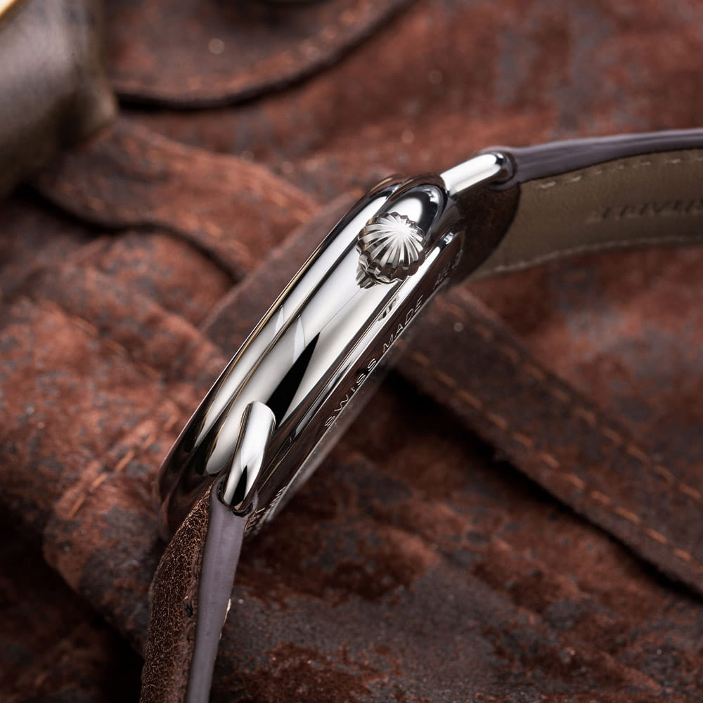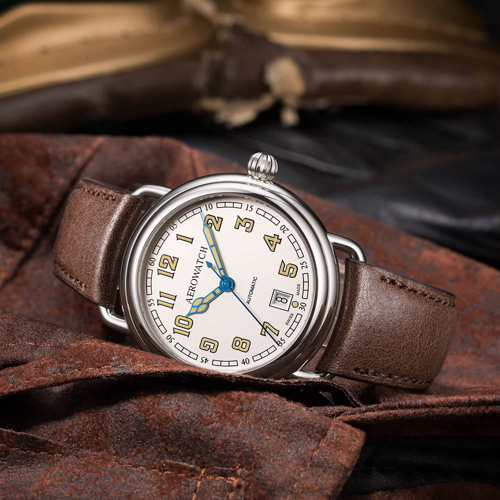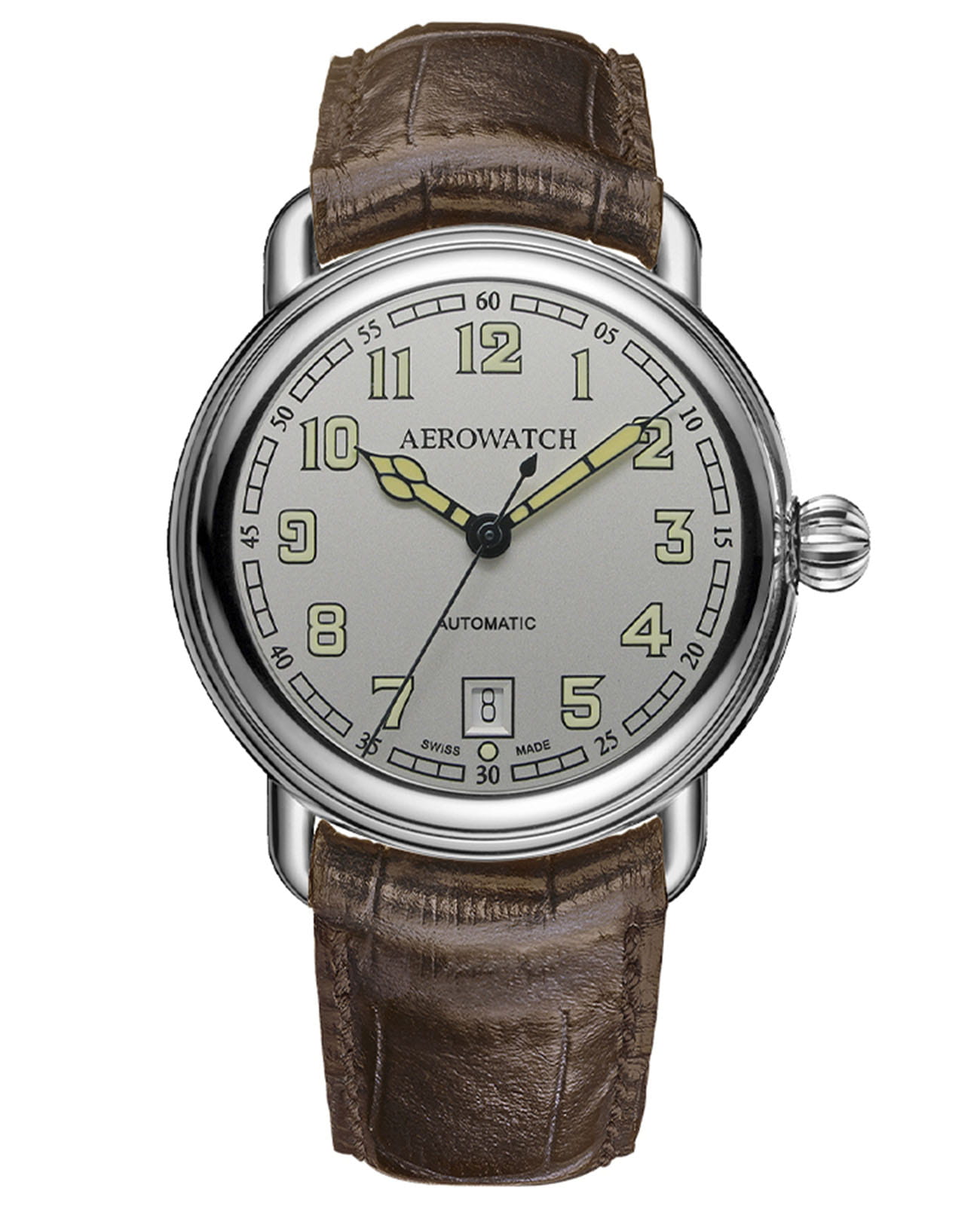 Мужские швейцарские механические часы с автоподзаводом Aerowatch Renaissance 1942 60900 AA20 . Сапфировое стеклоСапфировое стеклоПрочный и надёжный материал из кристалла сапфира синтетического происхождения, характеризующийся особой твёрдостью и устойчивостью к царапинам и повреждениям. устойчивое к появлению царапин, обладающее высокой прозрачностью. Корпус изготовлен из нержавеющей стали. Серебристый циферблат украшают арабские цифры с люминесцентным покрытиемЛюминесцентное покрытиеПозволяет считывать показания времени в темноте. Производители наносят на стрелки, часовые индексы, безель или поверхность циферблата светонакопительный состав, дающий холодное свечение. в винтажном стиле, окошко даты в положении 6 часов. Класс водозащиты: 50 метров, позволит защитить корпус от случайных брызг или капель дождя. Кожаный ремешок на стандартной застёжке.