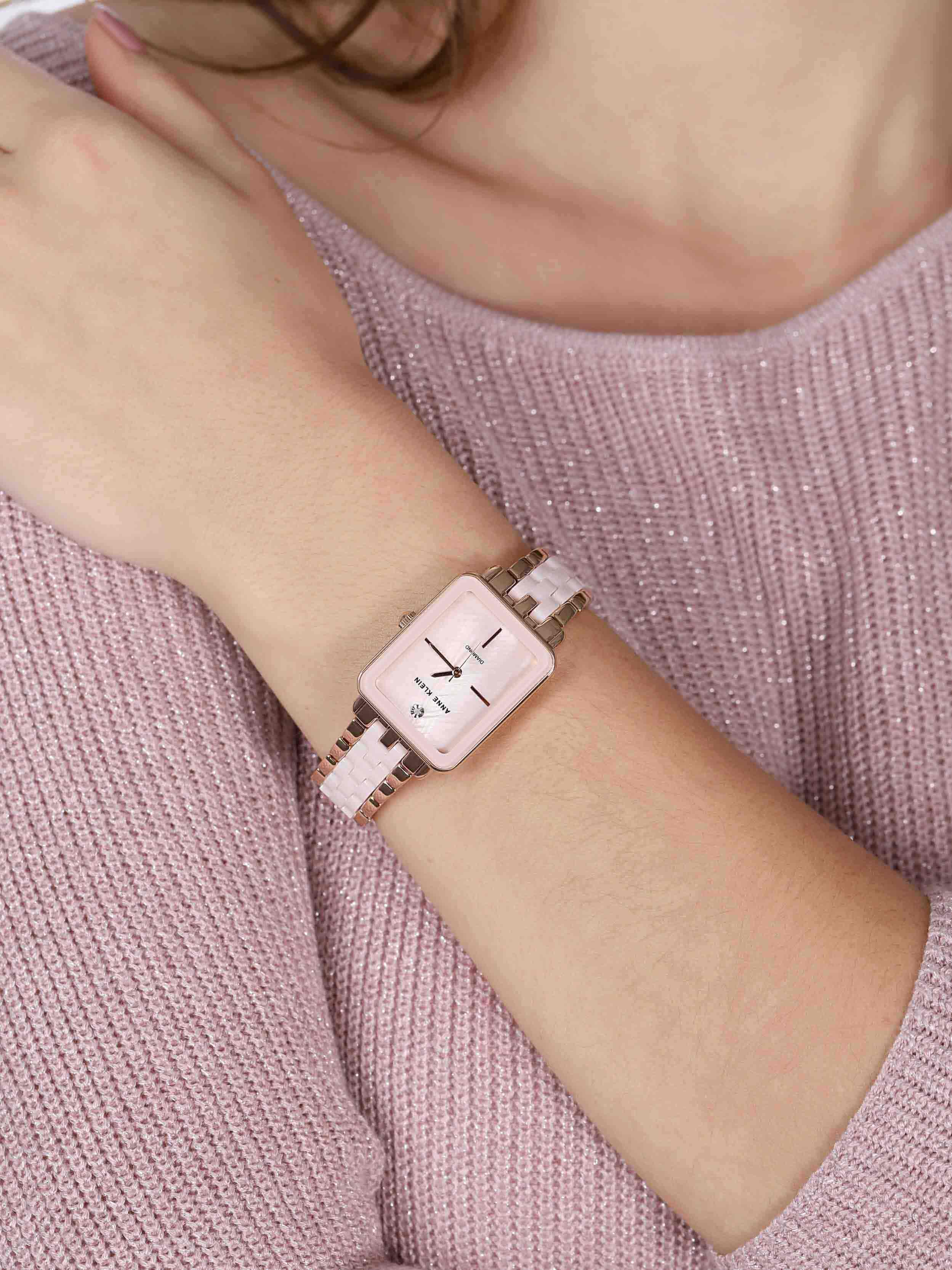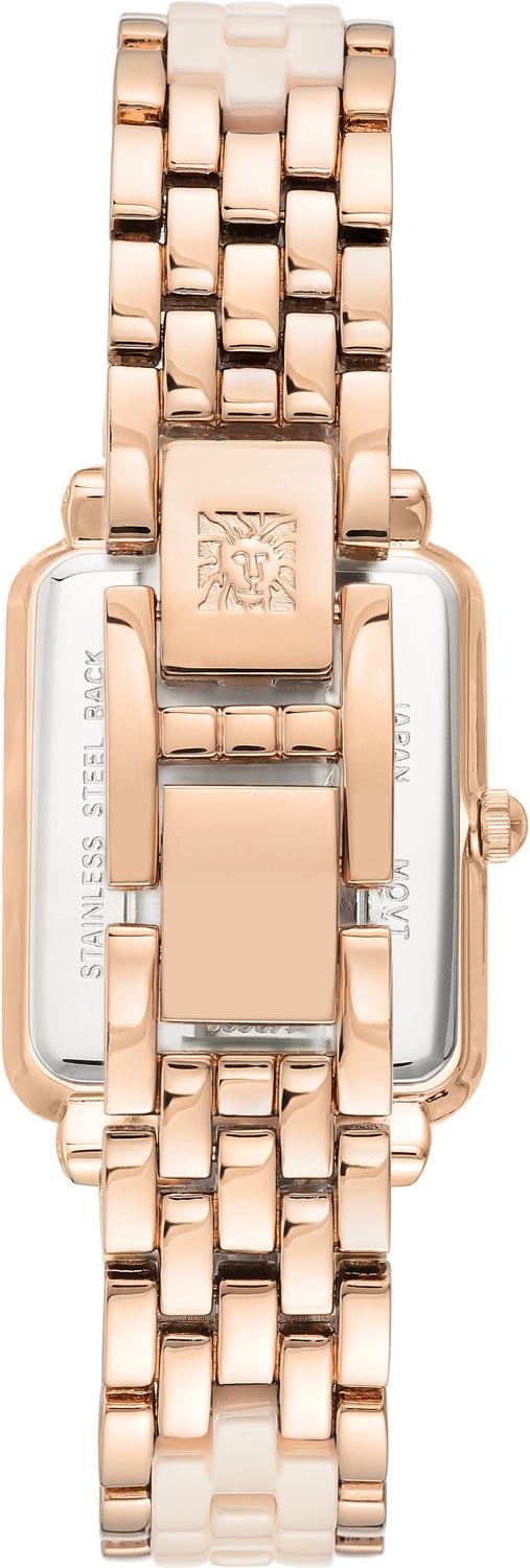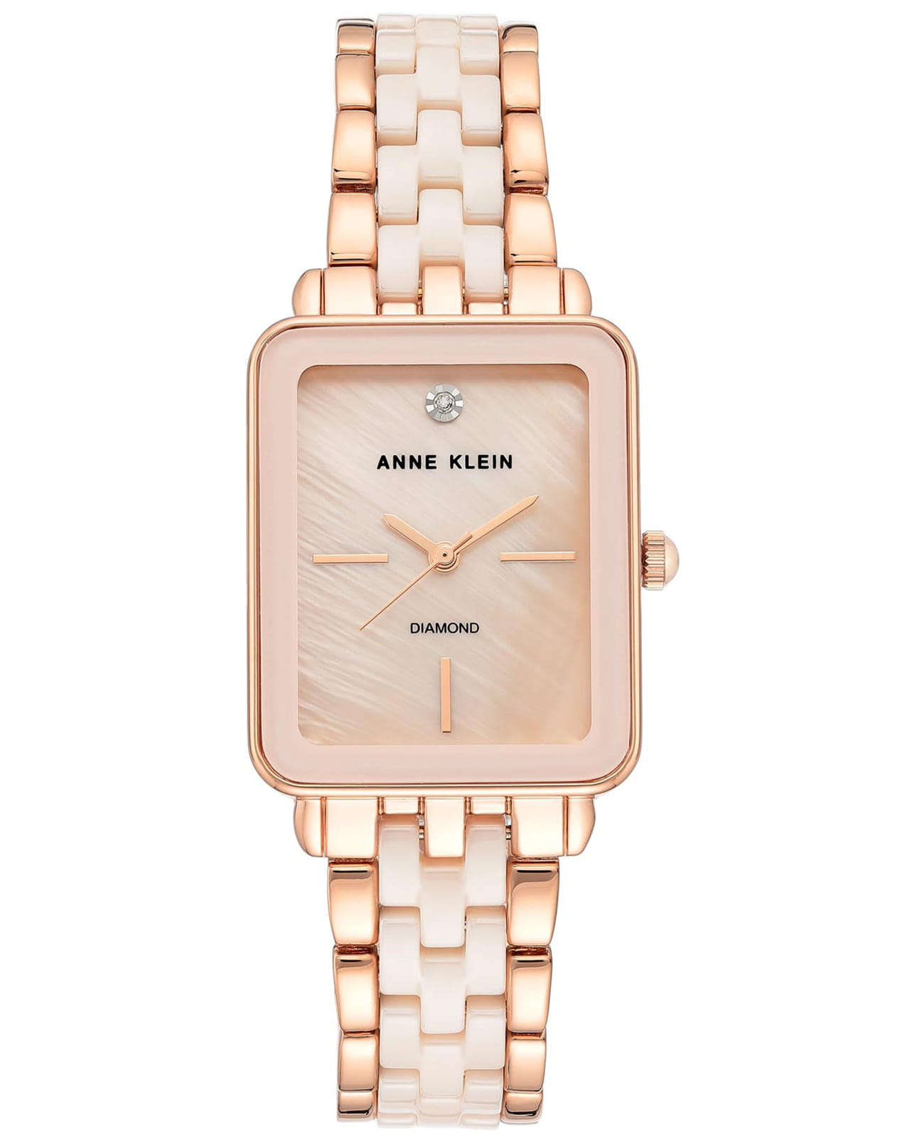 Женские американские часы с бриллиантом Anne Klein Diamond 3668LPRG, кварцевый механизм с высокой точностью. Класс водозащиты: 30 метров, позволит защитить корпус от случайных брызг или капель дождя. Корпус часов изготовлен из стали с розовым PVDPVDУльтратонкое покрытие наносится в технике вакуумного напыления, сочетает в себе нитрид титана особой прочности со слоем золота или оксида хрома. Несёт в себе декоративную или защитную функцию. покрытием. Перламутровый циферблат с бриллиантом на отметке ''12 часов'' и минеральным стекломМинеральное стеклоМинеральное стекло представляет собой искусственно выращенный минерал кварца. Такое стекло отличается особой устойчивостью к повреждениям и царапинам. Уступает по некоторым качествам сапфировому стеклу.. Браслет с керамическими вставками и розовым PVDPVDУльтратонкое покрытие наносится в технике вакуумного напыления, сочетает в себе нитрид титана особой прочности со слоем золота или оксида хрома. Несёт в себе декоративную или защитную функцию. покрытием.