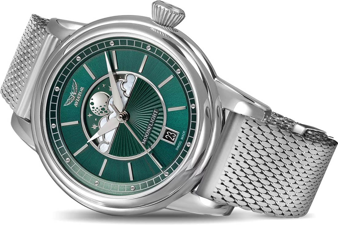 Aviator Douglas MoonFlight V.1.33.0.262.5— элегантные дамские швейцарские часы с утончённой авиационной эстетикой. Корпус 36 мм из нержавеющей стали 316L обладает компактными пропорциями и удобным профилем. Циферблат в стиле Art Deco украшает усложнение фаз Луны в верхней половине, обрамлённой тонким кольцом облаков. Отмечено окно даты в положении «6 часов». Стрелки обработаны люминесцентным покрытиемЛюминесцентное покрытиеПозволяет считывать показания времени в темноте. Производители наносят на стрелки, часовые индексы, безель или поверхность циферблата светонакопительный состав, дающий холодное свечение. Superluminova — для уверенного считывания в темноте. Поверхность защищена сапфировым стекломСапфировое стеклоПрочный и надёжный материал из кристалла сапфира синтетического происхождения, характеризующийся особой твёрдостью и устойчивостью к царапинам и повреждениям. с антибликовым покрытиемАнтибликовое покрытиеСлой оксида металла в 0,13-0,3 микрон, благодаря которому стекло часов не бликует и не отражает свет. Антибликовое покрытие уменьшает отражение света в 10 раз, обеспечивая отличную читаемость показателей циферблата.. Сердце модели — швейцарский кварцевый механизм Ronda 708 с функцией отображения лунных фаз, 13 рубинами и возможностью работать до 54 месяцев без замены батареи. Завинчивающаяся задняя крышка с гравировкой Douglas DC-3 и герметичность до 100 метров создают надёжную основу для эксплуатации. Стальной браслет миланского плетения на раскладном замкеРаскладной замокДанный вариант застежки используется только на часах с металлическим браслетом. Отличительная особенность такого крепления в том, что длина браслета становится универсальной и вы можете самостоятельно отрегулировать нужный вам размер – застежка просто двигается по браслету часов., сочетая комфорт, элегантность и практичность. Лимитированная серия - 950 экземпляров. Aviator Douglas MoonFlight — это гармоничное сочетание авиационного наследия, женской элегантности и технической изысканности, воплощённое в элегантном и функциональном аксессуаре.
