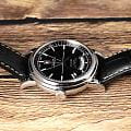 Циферблат с сатинированной отделкой оформлен в духе Art Deco. В верхней части — изогнутое окошко дня недели, в нижней — классический индикатор даты. Крупные арабские цифры, минутная шкала и стрелки типа «ланцет» обеспечивают превосходную читаемость. Для удобства в условиях слабого освещения стрелки и метки покрыты люминесцентным покрытиемЛюминесцентное покрытиеПозволяет считывать показания времени в темноте. Производители наносят на стрелки, часовые индексы, безель или поверхность циферблата светонакопительный состав, дающий холодное свечение..