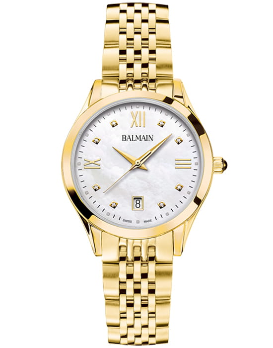 Женские часы Balmain Classic R B4310.31.82 кварцевый механизм с высокой точностью. Сапфировое стеклоСапфировое стеклоПрочный и надёжный материал из кристалла сапфира синтетического происхождения, характеризующийся особой твёрдостью и устойчивостью к царапинам и повреждениям. устойчивое к появлению царапин, обладающее высокой прозрачностью. Корпус изготовлен из нержавеющей стали PVD-покрытиемPVDУльтратонкое покрытие наносится в технике вакуумного напыления, сочетает в себе нитрид титана особой прочности со слоем золота или оксида хрома. Несёт в себе декоративную или защитную функцию.. Класс водозащиты: 50 метров, позволит защитить корпус от случайных брызг или капель дождя. Стальной браслет с PVD-покрытиемPVDУльтратонкое покрытие наносится в технике вакуумного напыления, сочетает в себе нитрид титана особой прочности со слоем золота или оксида хрома. Несёт в себе декоративную или защитную функцию.. на застёжке «бабочка» с кнопкамиЗастёжка "бабочка"Такой вид застёжки дополняется предохранителями, помогающими избежать случайного раскрытия браслета. Обладают изящным исполнением. . БезельБезельВнешний ободок, закрепляющий стекло. В спортивных часах так называется поворотное кольцо с делениями на циферблате, выполняет роль таймера – замеряет отрезки времени на шкале. Неподвижный безель – элемент декора. Однонаправленно вращающийся безель на дайверских часах позволяет фиксировать моменты погружения и выныривания на поверхность. с PVD-покрытиемPVDУльтратонкое покрытие наносится в технике вакуумного напыления, сочетает в себе нитрид титана особой прочности со слоем золота или оксида хрома. Несёт в себе декоративную или защитную функцию.. Календарь в положении 6 часов. Циферблат с 8 бриллиантами группы Top Wesselton VS-SI общим весом 0.030 карата