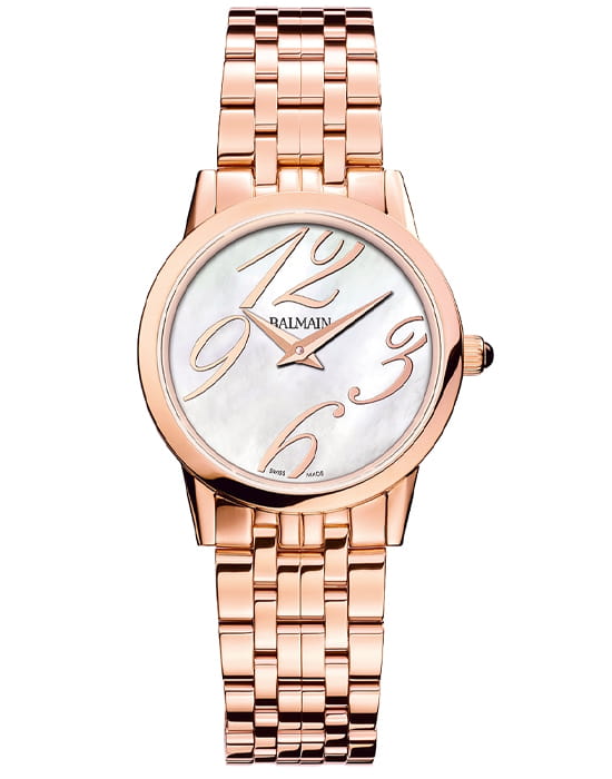 Женские часы Balmain Eria Bijou B8559.33.84 кварцевый механизм с высокой точностью. Сапфировое стеклоСапфировое стеклоПрочный и надёжный материал из кристалла сапфира синтетического происхождения, характеризующийся особой твёрдостью и устойчивостью к царапинам и повреждениям. устойчивое к появлению царапин, обладающее высокой прозрачностью. Корпус изготовлен из нержавеющей стали PVD-покрытиемPVDУльтратонкое покрытие наносится в технике вакуумного напыления, сочетает в себе нитрид титана особой прочности со слоем золота или оксида хрома. Несёт в себе декоративную или защитную функцию.. Класс водозащиты: 50 метров, позволит защитить корпус от случайных брызг или капель дождя. Стальной браслет с PVD-покрытиемPVDУльтратонкое покрытие наносится в технике вакуумного напыления, сочетает в себе нитрид титана особой прочности со слоем золота или оксида хрома. Несёт в себе декоративную или защитную функцию.. на застёжке «бабочка» с кнопкамиЗастёжка "бабочка"Такой вид застёжки дополняется предохранителями, помогающими избежать случайного раскрытия браслета. Обладают изящным исполнением. .