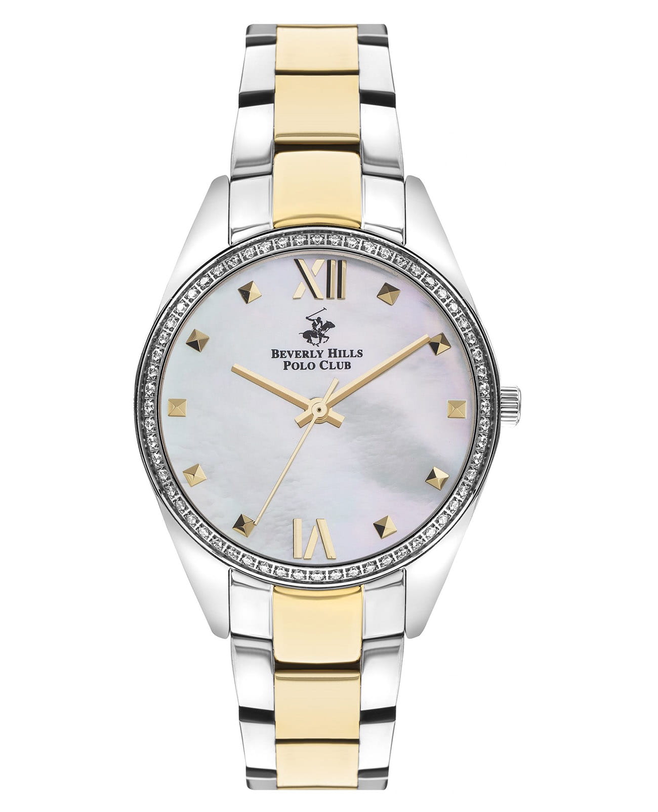 Американские женские часы с минеральным стеклом Beverly Hills Polo Club BP3300X.120 с минеральным стекломМинеральное стеклоМинеральное стекло представляет собой искусственно выращенный минерал кварца. Такое стекло отличается особой устойчивостью к повреждениям и царапинам. Уступает по некоторым качествам сапфировому стеклу., кварцевый механизм с высокой точностью. Класс водозащиты: 50 метров, позволит защитить корпус от случайных брызг или капель дождя. Браслет часов изготовлены из стали, с частичным IP-покрытиемIP-покрытиеМетод ионного напыления. Демонстрирует повышенную устойчивость к истиранию, окислению и химическим веществам. Под воздействием высокого давления и температуры около 1500°C молекулы металла надёжно соединяются с частицами корпуса часов.. Браслет с раскладной застёжкойРаскладная застёжкаТакой тип застёжки используется только на браслетах из металла. Она никогда не раскрывается полностью, происходит разделение на 2 и более частей. Раскладывающая застёжка снизит вероятность потери часов к минимуму.