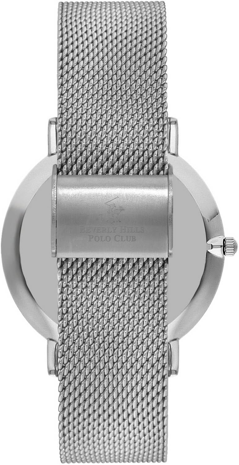 Американские мужские часы с минеральным стекломМинеральное стеклоМинеральное стекло представляет собой искусственно выращенный минерал кварца. Такое стекло отличается особой устойчивостью к повреждениям и царапинам. Уступает по некоторым качествам сапфировому стеклу. Beverly Hills Polo Club BP3321X.330, кварцевый механизм с высокой точностью. Класс водозащиты: 50 метров, позволит защитить корпус от случайных брызг и капель дождя. Стальной корпус. Браслет на раскладной застёжкеРаскладная застёжкаТакой тип застёжки используется только на браслетах из металла. Она никогда не раскрывается полностью, происходит разделение на 2 и более частей. Раскладывающая застёжка снизит вероятность потери часов к минимуму..