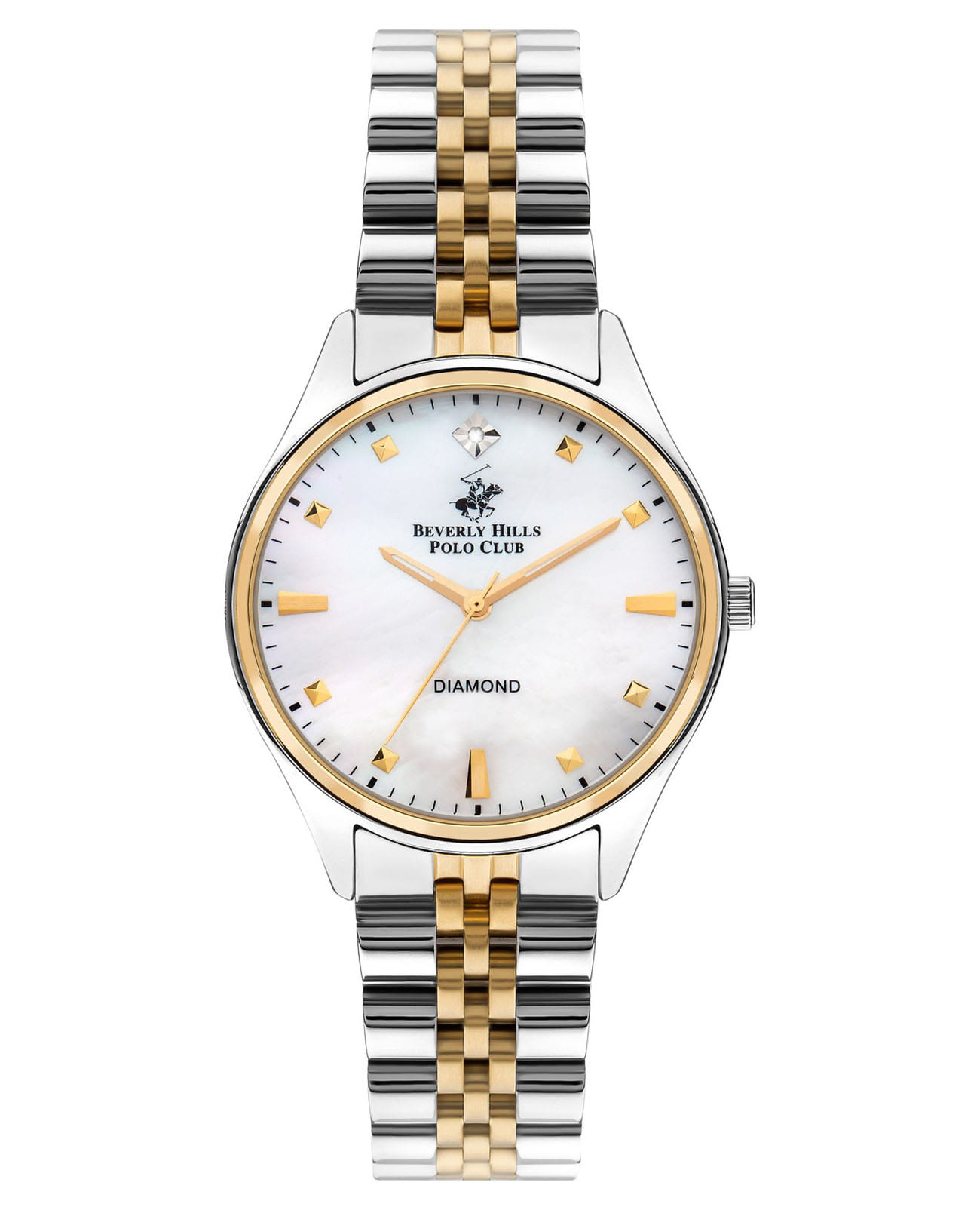 Американские женские часы с минеральным стекломМинеральное стеклоМинеральное стекло представляет собой искусственно выращенный минерал кварца. Такое стекло отличается особой устойчивостью к повреждениям и царапинам. Уступает по некоторым качествам сапфировому стеклу. Beverly Hills Polo Club BP3390C.220, кварцевый механизм с высокой точностью. Корпус и браслет часов изготовлены из нержавеющей стали с частичным IP-покрытиемIP-покрытиеМетод ионного напыления. Демонстрирует повышенную устойчивость к истиранию, окислению и химическим веществам. Под воздействием высокого давления и температуры около 1500°C молекулы металла надёжно соединяются с частицами корпуса часов.. Неподвижный безельБезельВнешний ободок, закрепляющий стекло. В спортивных часах так называется поворотное кольцо с делениями на циферблате, выполняет роль таймера – замеряет отрезки времени на шкале. Неподвижный безель – элемент декора. Однонаправленно вращающийся безель на дайверских часах позволяет фиксировать моменты погружения и выныривания на поверхность. из нержавеющей стали IP-покрытиемIP-покрытиеМетод ионного напыления. Демонстрирует повышенную устойчивость к истиранию, окислению и химическим веществам. Под воздействием высокого давления и температуры около 1500°C молекулы металла надёжно соединяются с частицами корпуса часов.. Циферблат украшен бриллиантом. Класс водозащиты: 50 метров, позволит защитить корпус от случайных брызг или капель дождя. Стальной браслет на раскладной застёжкеРаскладная застёжкаТакой тип застёжки используется только на браслетах из металла. Она никогда не раскрывается полностью, происходит разделение на 2 и более частей. Раскладывающая застёжка снизит вероятность потери часов к минимуму..
