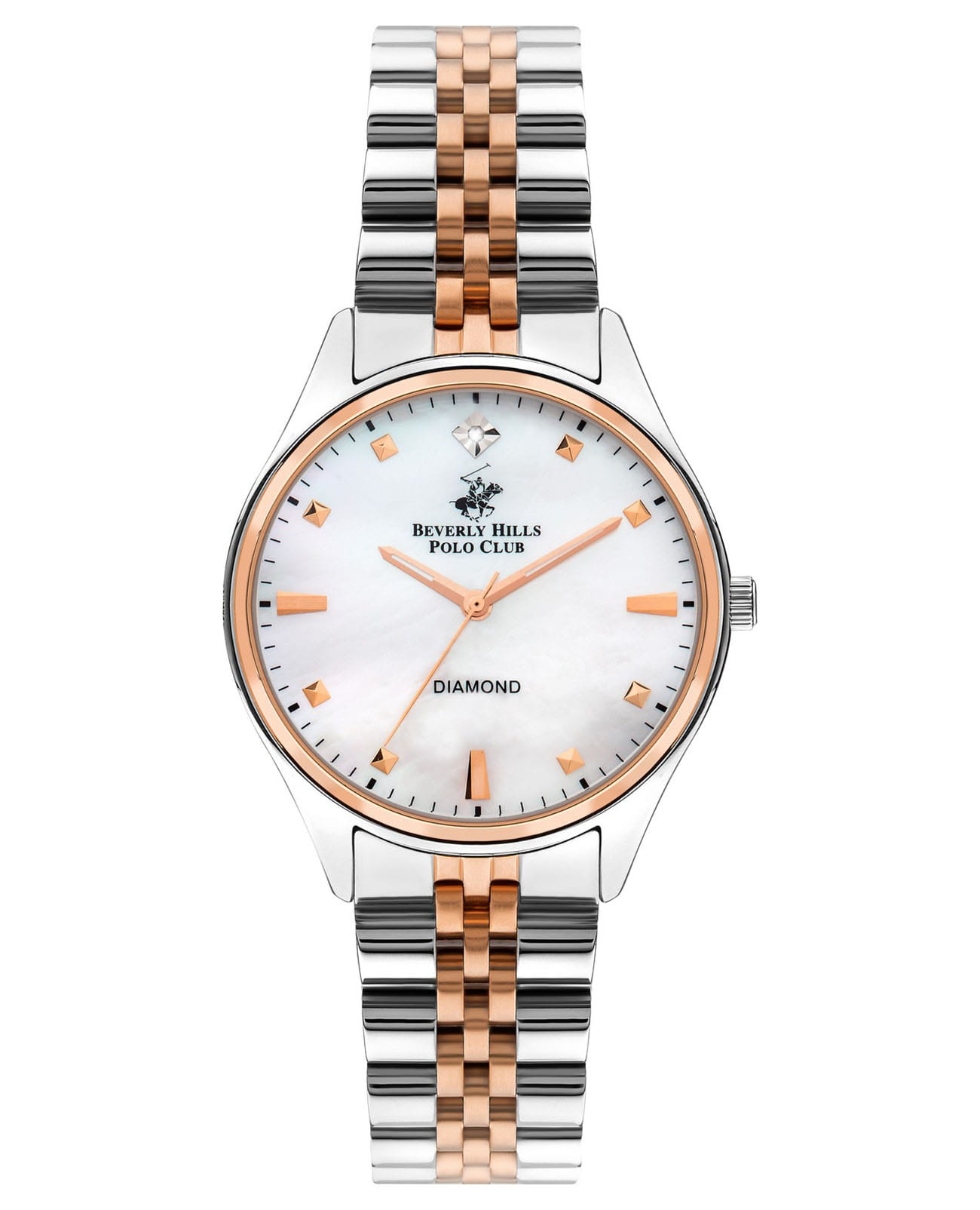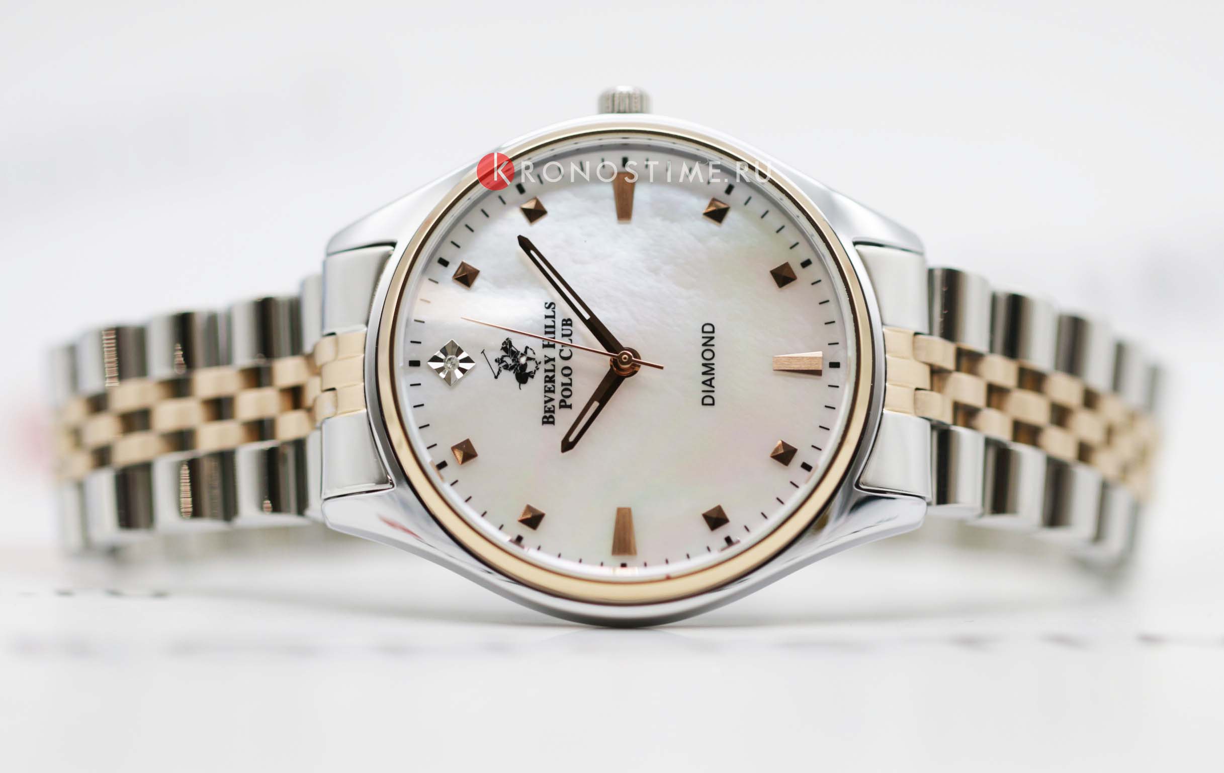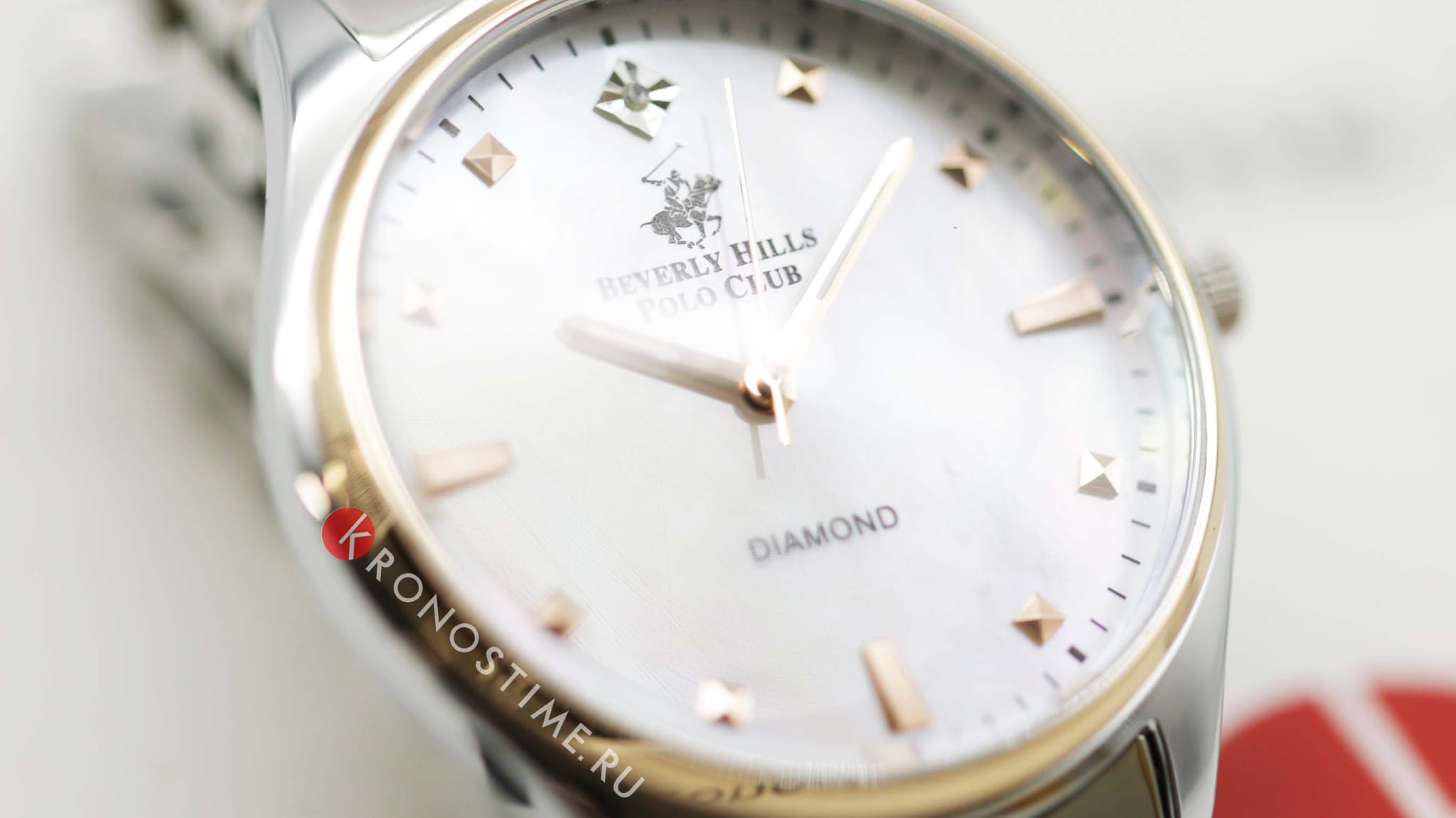 Американские женские часы с минеральным стекломМинеральное стеклоМинеральное стекло представляет собой искусственно выращенный минерал кварца. Такое стекло отличается особой устойчивостью к повреждениям и царапинам. Уступает по некоторым качествам сапфировому стеклу. Beverly Hills Polo Club BP3390C.520, кварцевый механизм с высокой точностью. Корпус и браслет часов изготовлены из нержавеющей стали с частичным IP-покрытиемIP-покрытиеМетод ионного напыления. Демонстрирует повышенную устойчивость к истиранию, окислению и химическим веществам. Под воздействием высокого давления и температуры около 1500°C молекулы металла надёжно соединяются с частицами корпуса часов.. Неподвижный безельБезельВнешний ободок, закрепляющий стекло. В спортивных часах так называется поворотное кольцо с делениями на циферблате, выполняет роль таймера – замеряет отрезки времени на шкале. Неподвижный безель – элемент декора. Однонаправленно вращающийся безель на дайверских часах позволяет фиксировать моменты погружения и выныривания на поверхность. из нержавеющей стали IP-покрытиемIP-покрытиеМетод ионного напыления. Демонстрирует повышенную устойчивость к истиранию, окислению и химическим веществам. Под воздействием высокого давления и температуры около 1500°C молекулы металла надёжно соединяются с частицами корпуса часов.. Циферблат украшен бриллиантом. Класс водозащиты: 50 метров, позволит защитить корпус от случайных брызг или капель дождя. Стальной браслет на раскладной застёжкеРаскладная застёжкаТакой тип застёжки используется только на браслетах из металла. Она никогда не раскрывается полностью, происходит разделение на 2 и более частей. Раскладывающая застёжка снизит вероятность потери часов к минимуму..