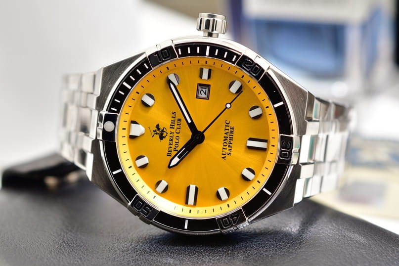 Американские мужские часы с сапфировым стекломСапфировое стеклоПрочный и надёжный материал из кристалла сапфира синтетического происхождения, характеризующийся особой твёрдостью и устойчивостью к царапинам и повреждениям. Beverly Hills Polo Club BP3575X.380, механический механизм (автоматический калибр) с высокой точностью. Сапфировое стеклоСапфировое стеклоПрочный и надёжный материал из кристалла сапфира синтетического происхождения, характеризующийся особой твёрдостью и устойчивостью к царапинам и повреждениям. устойчивое к появлению царапин, обладающее высокой прозрачностью. Класс водозащиты: 100 метров, позволит плавать, нырять и заниматься другими водными видами спорта. Корпус часов изготовлен из стали. Стальной браслет на раскладной застёжкеРаскладная застёжкаТакой тип застёжки используется только на браслетах из металла. Она никогда не раскрывается полностью, происходит разделение на 2 и более частей. Раскладывающая застёжка снизит вероятность потери часов к минимуму.. БезельБезельВнешний ободок, закрепляющий стекло. В спортивных часах так называется поворотное кольцо с делениями на циферблате, выполняет роль таймера – замеряет отрезки времени на шкале. Неподвижный безель – элемент декора. Однонаправленно вращающийся безель на дайверских часах позволяет фиксировать моменты погружения и выныривания на поверхность. с IP-покрытиемIP-покрытиеМетод ионного напыления. Демонстрирует повышенную устойчивость к истиранию, окислению и химическим веществам. Под воздействием высокого давления и температуры около 1500°C молекулы металла надёжно соединяются с частицами корпуса часов..Стрелки и метки с люминесцентным покрытиемЛюминесцентное покрытиеПозволяет считывать показания времени в темноте. Производители наносят на стрелки, часовые индексы, безель или поверхность циферблата светонакопительный состав, дающий холодное свечение..