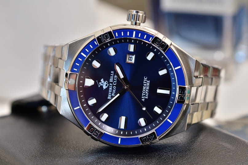 Американские мужские часы с сапфировым стекломСапфировое стеклоПрочный и надёжный материал из кристалла сапфира синтетического происхождения, характеризующийся особой твёрдостью и устойчивостью к царапинам и повреждениям. Beverly Hills Polo Club BP3575X.390, механический механизм (автоматический калибр) с высокой точностью. Сапфировое стеклоСапфировое стеклоПрочный и надёжный материал из кристалла сапфира синтетического происхождения, характеризующийся особой твёрдостью и устойчивостью к царапинам и повреждениям. устойчивое к появлению царапин, обладающее высокой прозрачностью. Класс водозащиты: 100 метров, позволит плавать, нырять и заниматься другими водными видами спорта. Корпус часов изготовлен из стали. Стальной браслет на раскладной застёжкеРаскладная застёжкаТакой тип застёжки используется только на браслетах из металла. Она никогда не раскрывается полностью, происходит разделение на 2 и более частей. Раскладывающая застёжка снизит вероятность потери часов к минимуму.. БезельБезельВнешний ободок, закрепляющий стекло. В спортивных часах так называется поворотное кольцо с делениями на циферблате, выполняет роль таймера – замеряет отрезки времени на шкале. Неподвижный безель – элемент декора. Однонаправленно вращающийся безель на дайверских часах позволяет фиксировать моменты погружения и выныривания на поверхность. с IP-покрытиемIP-покрытиеМетод ионного напыления. Демонстрирует повышенную устойчивость к истиранию, окислению и химическим веществам. Под воздействием высокого давления и температуры около 1500°C молекулы металла надёжно соединяются с частицами корпуса часов..Стрелки и метки с люминесцентным покрытиемЛюминесцентное покрытиеПозволяет считывать показания времени в темноте. Производители наносят на стрелки, часовые индексы, безель или поверхность циферблата светонакопительный состав, дающий холодное свечение..
