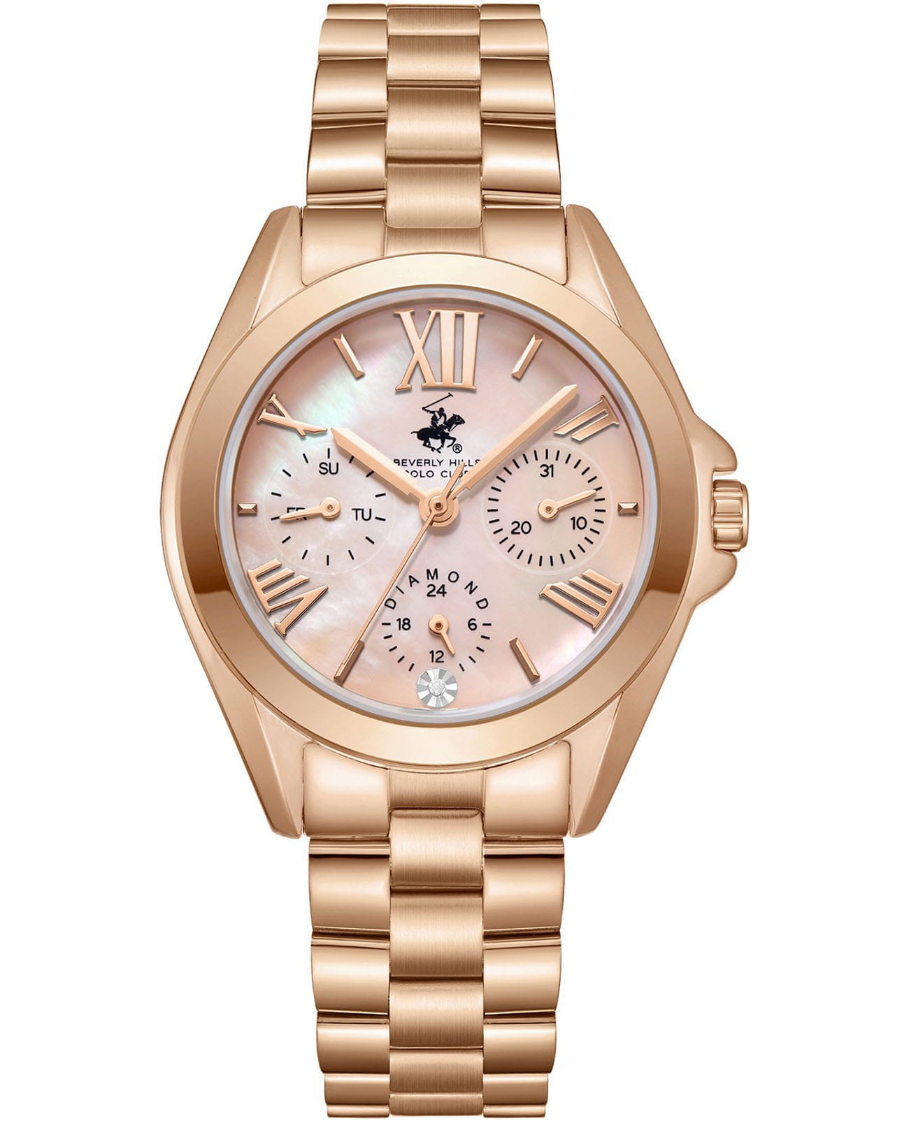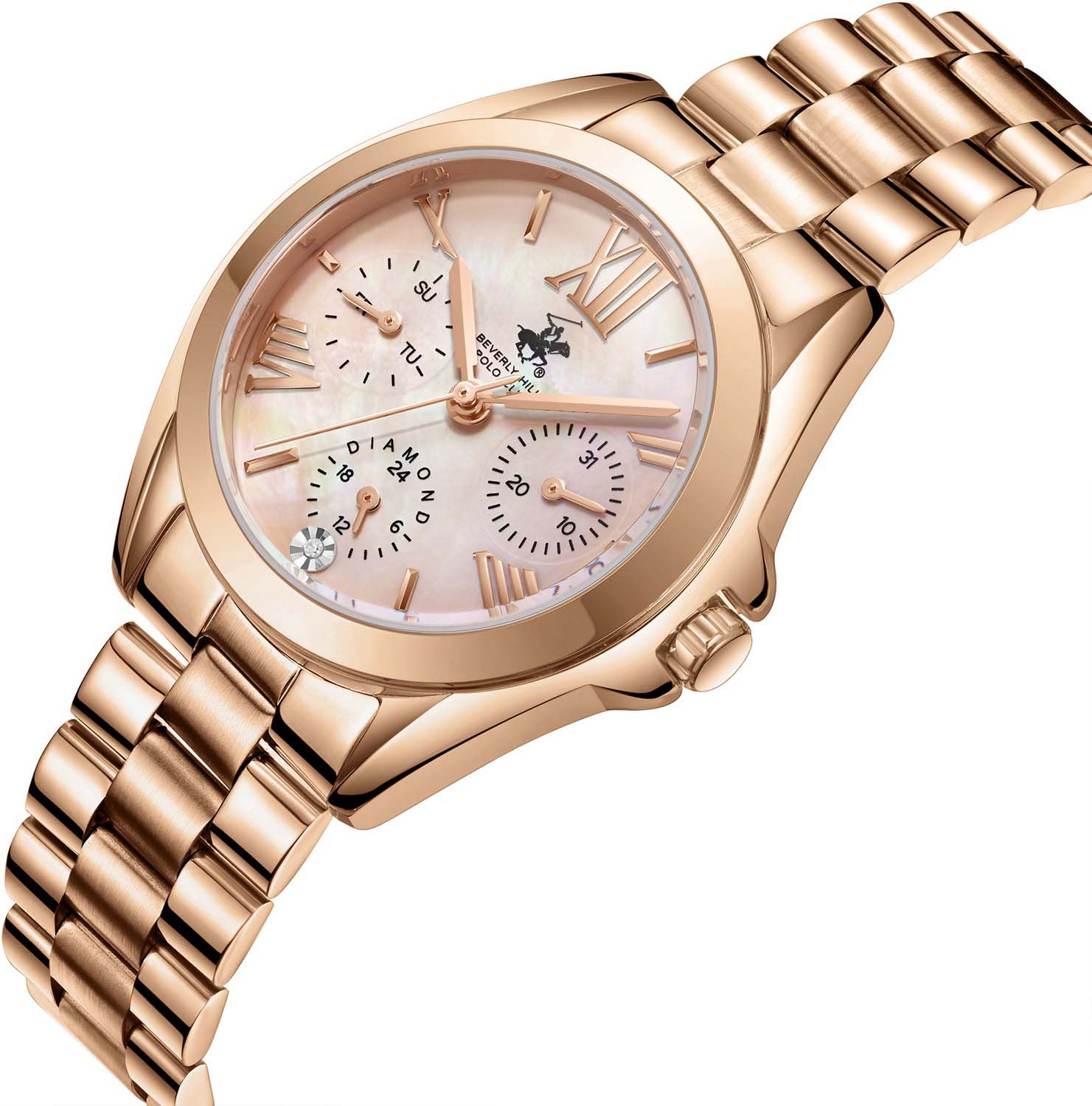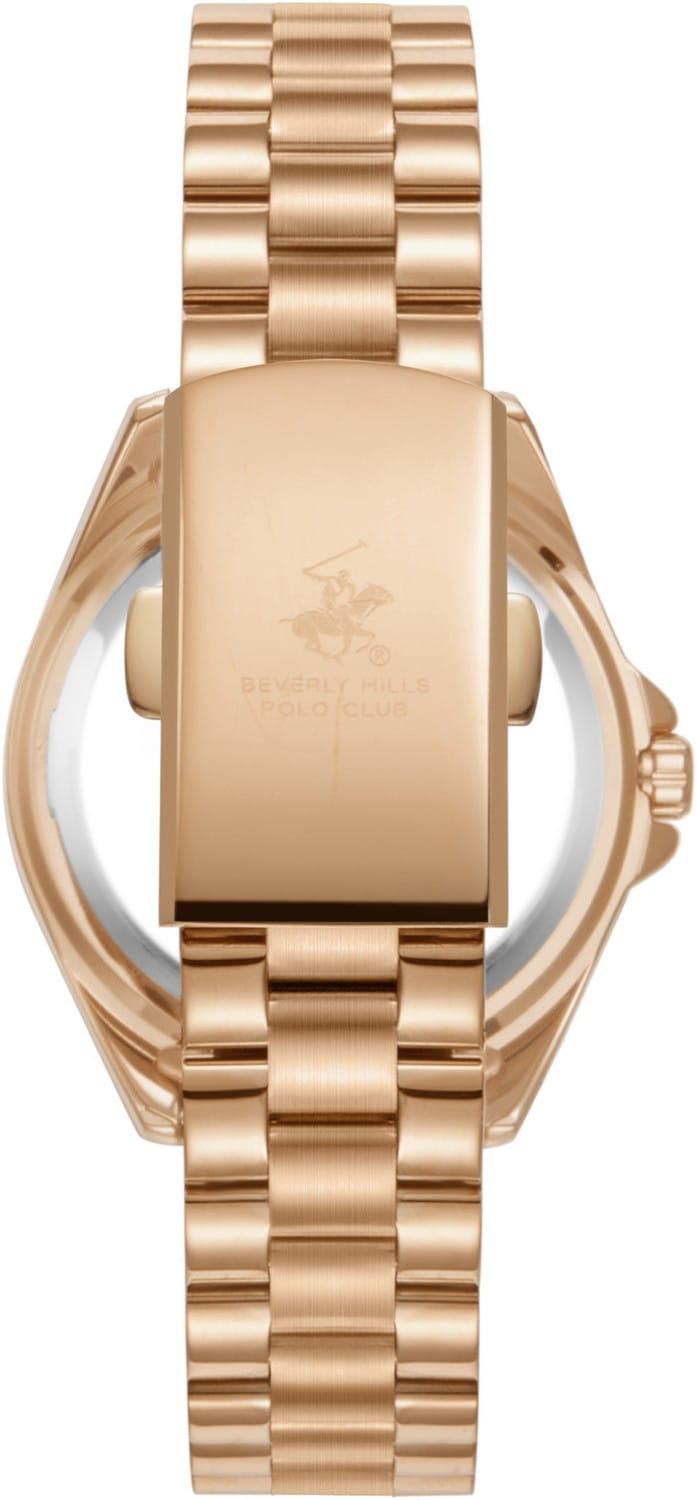Женские наручные часы Beverly Hills Polo Club BP3653C.410 с надёжным кварцевым механизмом. Минеральное стеклоМинеральное стеклоМинеральное стекло представляет собой искусственно выращенный минерал кварца. Такое стекло отличается особой устойчивостью к повреждениям и царапинам. Уступает по некоторым качествам сапфировому стеклу. устойчивое к мелким механическим повреждениям. Корпус часов изготовлен из суперметалла с IP-покрытиемIP-покрытиеМетод ионного напыления. Демонстрирует повышенную устойчивость к истиранию, окислению и химическим веществам. Под воздействием высокого давления и температуры около 1500°C молекулы металла надёжно соединяются с частицами корпуса часов.. Класс водозащиты: 50 метров, позволит защитить корпус от случайных брызг или капель дождя. Стальной браслет с IP-покрытиемIP-покрытиеМетод ионного напыления. Демонстрирует повышенную устойчивость к истиранию, окислению и химическим веществам. Под воздействием высокого давления и температуры около 1500°C молекулы металла надёжно соединяются с частицами корпуса часов. на раскладной застёжкеРаскладная застёжкаТакой тип застёжки используется только на браслетах из металла. Она никогда не раскрывается полностью, происходит разделение на 2 и более частей. Раскладывающая застёжка снизит вероятность потери часов к минимуму..