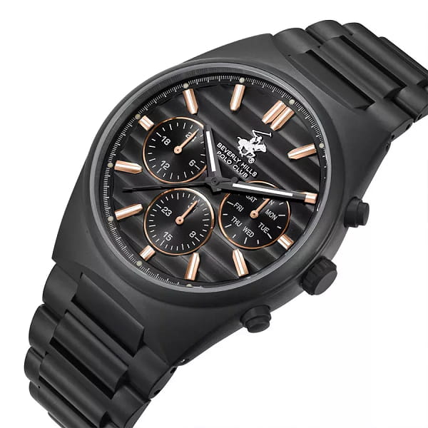 С уровнем водозащиты до 100 метров, эти часы готовы сопровождать вас в любых водных приключениях: будь то плавание, ныряние или активные занятия спортом. Стальной браслет с частичным PVD-покрытиемPVDУльтратонкое покрытие наносится в технике вакуумного напыления, сочетает в себе нитрид титана особой прочности со слоем золота или оксида хрома. Несёт в себе декоративную или защитную функцию. на застёжке-бабочке с кнопкамиЗастёжка "бабочка"Такой вид застёжки дополняется предохранителями, помогающими избежать случайного раскрытия браслета. Обладают изящным исполнением. . На циферблате отображается не только текущее время, но и такие полезные функции, как дата, день недели, 24-часовой формат.Стрелки с люминесцентным покрытиемЛюминесцентное покрытиеПозволяет считывать показания времени в темноте. Производители наносят на стрелки, часовые индексы, безель или поверхность циферблата светонакопительный состав, дающий холодное свечение. придают удобство в использовании в темное время суток. Эта модель — истинное воплощение философии Beverly Hills Polo Club: сочетание высоких стандартов качества и неподражаемого стиля, создающее аксессуар, который станет вашим верным компаньоном в повседневной жизни.