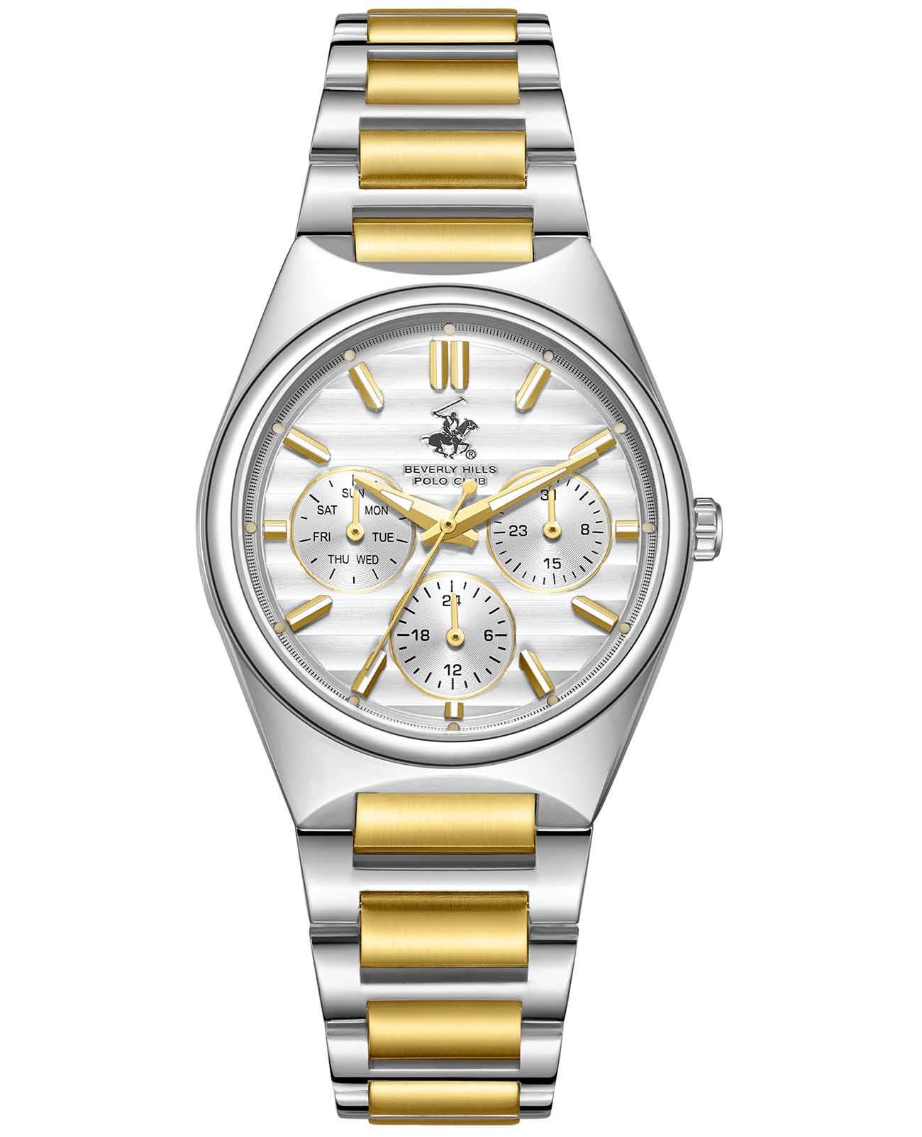 Beverly Hills Polo Club BP3746C.330 – элегантные женские часы, сочетающие стильный дизайн и высокую функциональность. Корпус диаметром 34 мм выполнен из суперметалла, обеспечивающего прочность и долговечность. Циферблат украшен, и защищён минеральным стекломМинеральное стеклоМинеральное стекло представляет собой искусственно выращенный минерал кварца. Такое стекло отличается особой устойчивостью к повреждениям и царапинам. Уступает по некоторым качествам сапфировому стеклу., устойчивым к царапинам. Часы оснащены точным кварцевым механизмом, гарантирующим надёжное отображение времени. Браслет из нержавеющей стали с PVD-покрытиемPVDУльтратонкое покрытие наносится в технике вакуумного напыления, сочетает в себе нитрид титана особой прочности со слоем золота или оксида хрома. Несёт в себе декоративную или защитную функцию. на застёжке-бабочке с кнопкамиЗастёжка "бабочка"Такой вид застёжки дополняется предохранителями, помогающими избежать случайного раскрытия браслета. Обладают изящным исполнением. , обеспечивающей комфортное ношение и надёжную фиксацию на запястье. Водозащита до 50 метров (5 ATM) позволяет использовать часы в повседневной жизни, включая кратковременное погружение в воду.