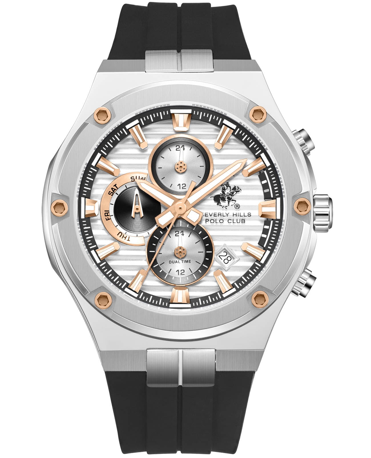 BEVERLY HILLS POLO CLUB BP3822X.331 — стильные мужские часы, сочетающие спортивную динамику и функциональность. Крупный корпус выполнен из нержавеющей стали серебристого цвета, диаметром 46,5 мм, гармонично дополнен каучуковым ремешком на стандартной застежке, что обеспечивает комфортное ношение. Минеральное стеклоМинеральное стеклоМинеральное стекло представляет собой искусственно выращенный минерал кварца. Такое стекло отличается особой устойчивостью к повреждениям и царапинам. Уступает по некоторым качествам сапфировому стеклу. с сапфировым покрытием защищает циферблат от царапин, а кварцевый механизм обеспечивает высокую точность. Благодаря своей универсальной эстетике эти часы уместны и в деловой среде, и в повседневном образе. Стрелки и метки с люминесцентным покрытиемЛюминесцентное покрытиеПозволяет считывать показания времени в темноте. Производители наносят на стрелки, часовые индексы, безель или поверхность циферблата светонакопительный состав, дающий холодное свечение., обеспечивающим хорошую читаемость в темноте. Указатель дня недели вынесен на отдельный циферблат, также присутствует индикация 24-часового формата времени. Окошко даты находится в положении между 4 и 5 часов. Идеальный выбор для тех, кто ценит элегантный дизайн и качество. Водозащита до 50 метров позволит защитить корпус от случайных брызг или капель дождя.