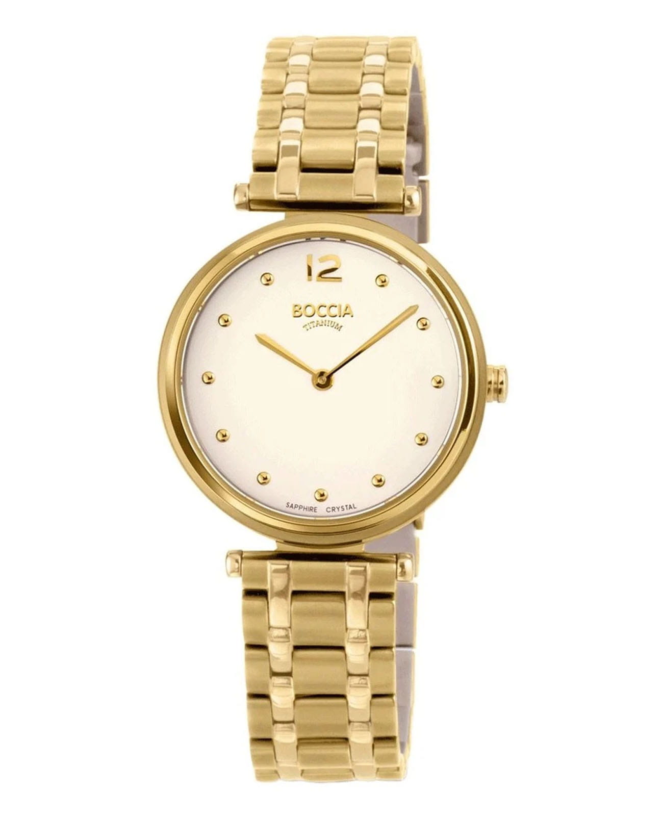 Женские наручные часы Boccia Titanium 3347-03 с надёжным кварцевым механизмом. Корпус и браслет часов изготовлены из титана с PVD-покрытиемPVDУльтратонкое покрытие наносится в технике вакуумного напыления, сочетает в себе нитрид титана особой прочности со слоем золота или оксида хрома. Несёт в себе декоративную или защитную функцию.. Минеральное стеклоМинеральное стеклоМинеральное стекло представляет собой искусственно выращенный минерал кварца. Такое стекло отличается особой устойчивостью к повреждениям и царапинам. Уступает по некоторым качествам сапфировому стеклу. устойчивое к мелким механическим повреждениям. Класс водозащиты: 50 метров, позволит защитить корпус от случайных брызг или капель дождя. Титановый браслет на раскладной застёжкеРаскладная застёжкаТакой тип застёжки используется только на браслетах из металла. Она никогда не раскрывается полностью, происходит разделение на 2 и более частей. Раскладывающая застёжка снизит вероятность потери часов к минимуму..