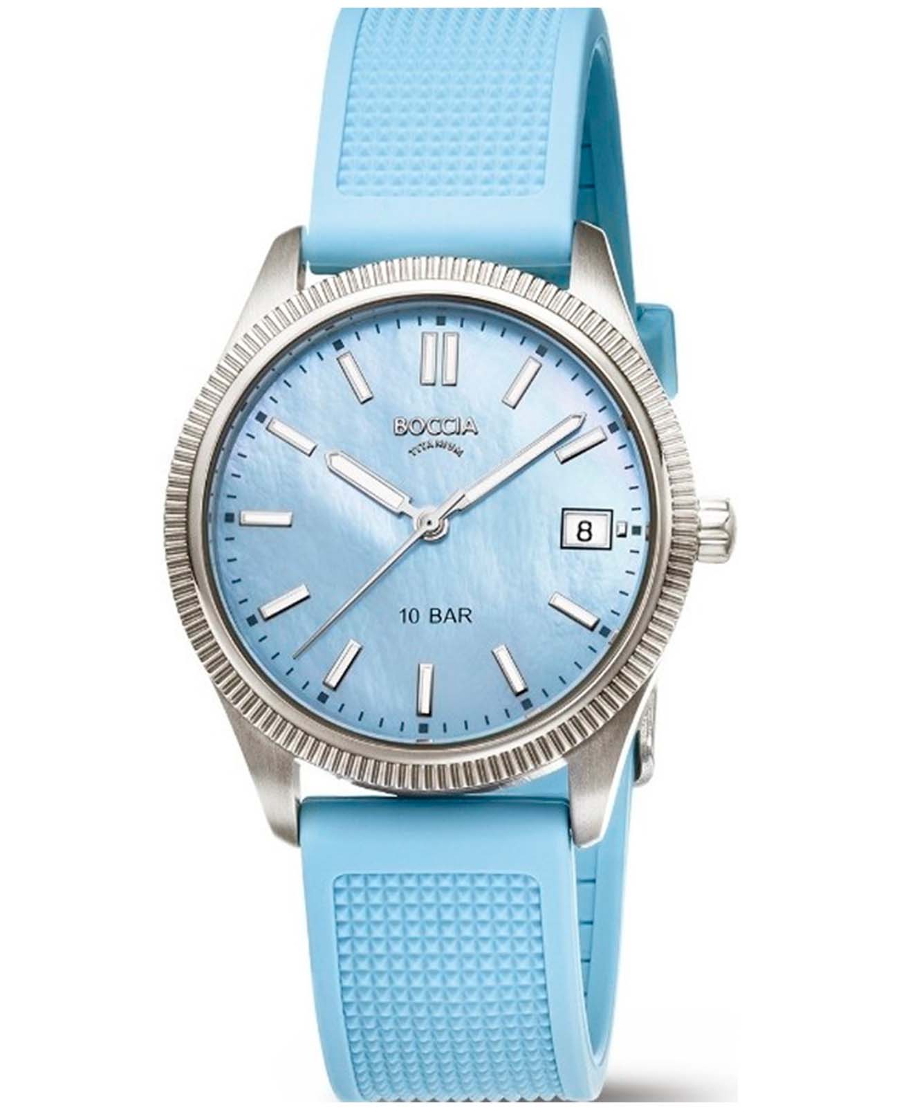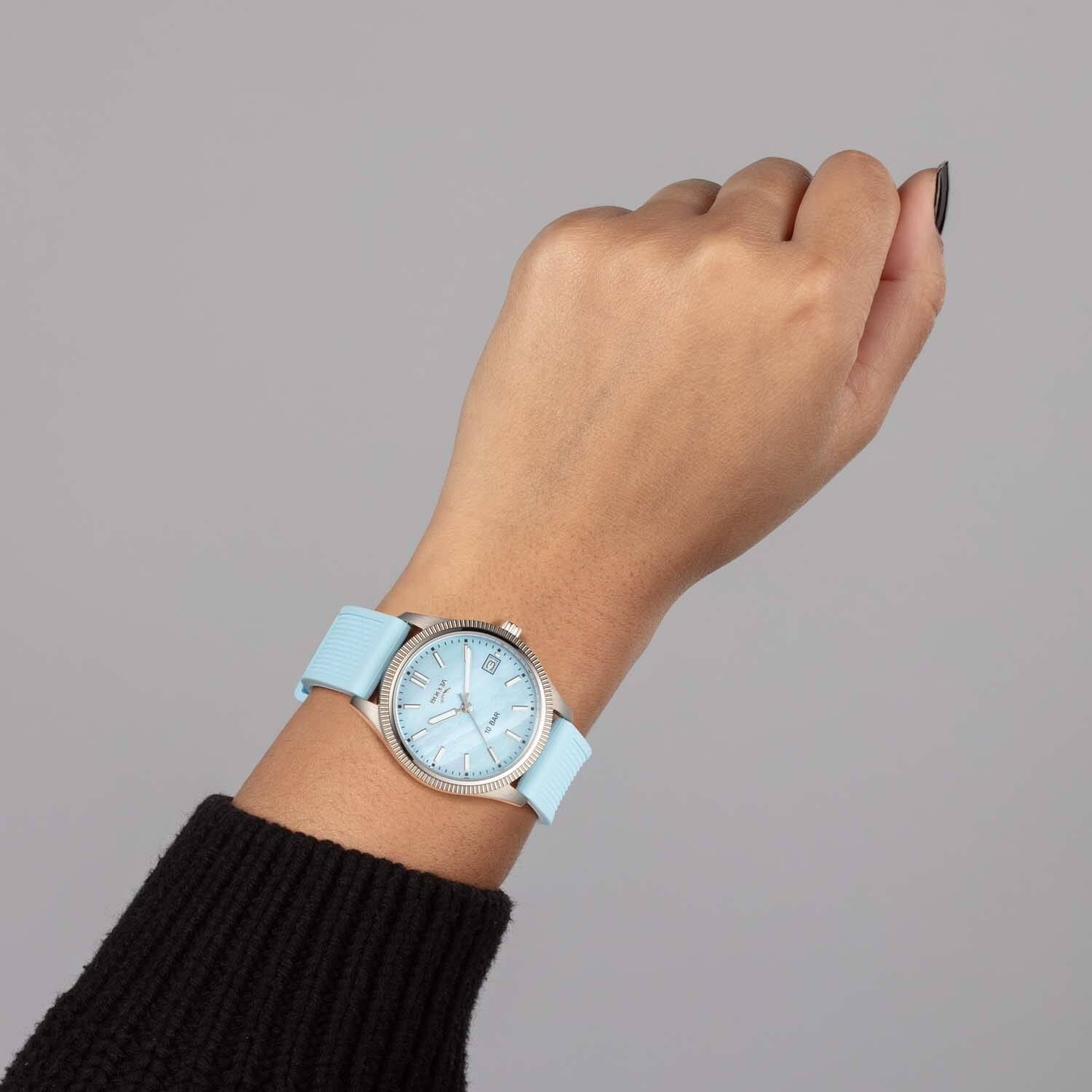 Эти женственные часы мгновенно привнесут нотку изысканности в любой ваш наряд! Легкий титановый корпус подчеркивает элегантность модели, а перламутровый циферблат с изящными штрихами-метками придает часам особый шарм. Стрелки и метки с люминесцентным покрытиемЛюминесцентное покрытиеПозволяет считывать показания времени в темноте. Производители наносят на стрелки, часовые индексы, безель или поверхность циферблата светонакопительный состав, дающий холодное свечение.. Минеральное стеклоМинеральное стеклоМинеральное стекло представляет собой искусственно выращенный минерал кварца. Такое стекло отличается особой устойчивостью к повреждениям и царапинам. Уступает по некоторым качествам сапфировому стеклу.. Окошко даты, расположенное на отметке «три часа», всегда напомнит о важном событии дня. Завершающим аккордом служит мягкий каучуковый ремешок с классической застежкой, обеспечивающий комфорт и надежность в носке. 100 метров, позволит плавать, нырять и заниматься другими водными видами спорта.