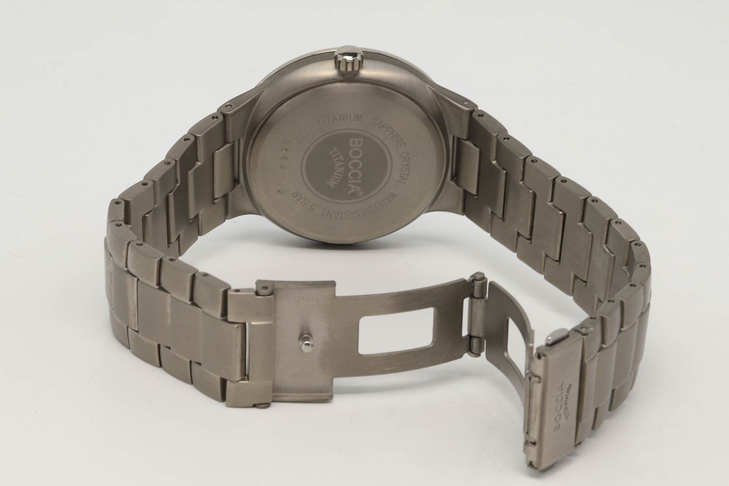 Мужские наручные часы Boccia Titanium 3652-02 с солнечной батареей. Сапфировое стеклоСапфировое стеклоПрочный и надёжный материал из кристалла сапфира синтетического происхождения, характеризующийся особой твёрдостью и устойчивостью к царапинам и повреждениям. устойчивое к мелким механическим повреждениям. Корпус и браслет часов изготовлены из титана. Титановый браслет на раскладной застёжкеРаскладная застёжкаТакой тип застёжки используется только на браслетах из металла. Она никогда не раскрывается полностью, происходит разделение на 2 и более частей. Раскладывающая застёжка снизит вероятность потери часов к минимуму.. Класс водозащиты: 50 метров, позволит защитить корпус от случайных брызг или капель дождя. Стрелки и метки с люминесцентным покрытиемЛюминесцентное покрытиеПозволяет считывать показания времени в темноте. Производители наносят на стрелки, часовые индексы, безель или поверхность циферблата светонакопительный состав, дающий холодное свечение.. Окошки даты находится в положении 3 часа.