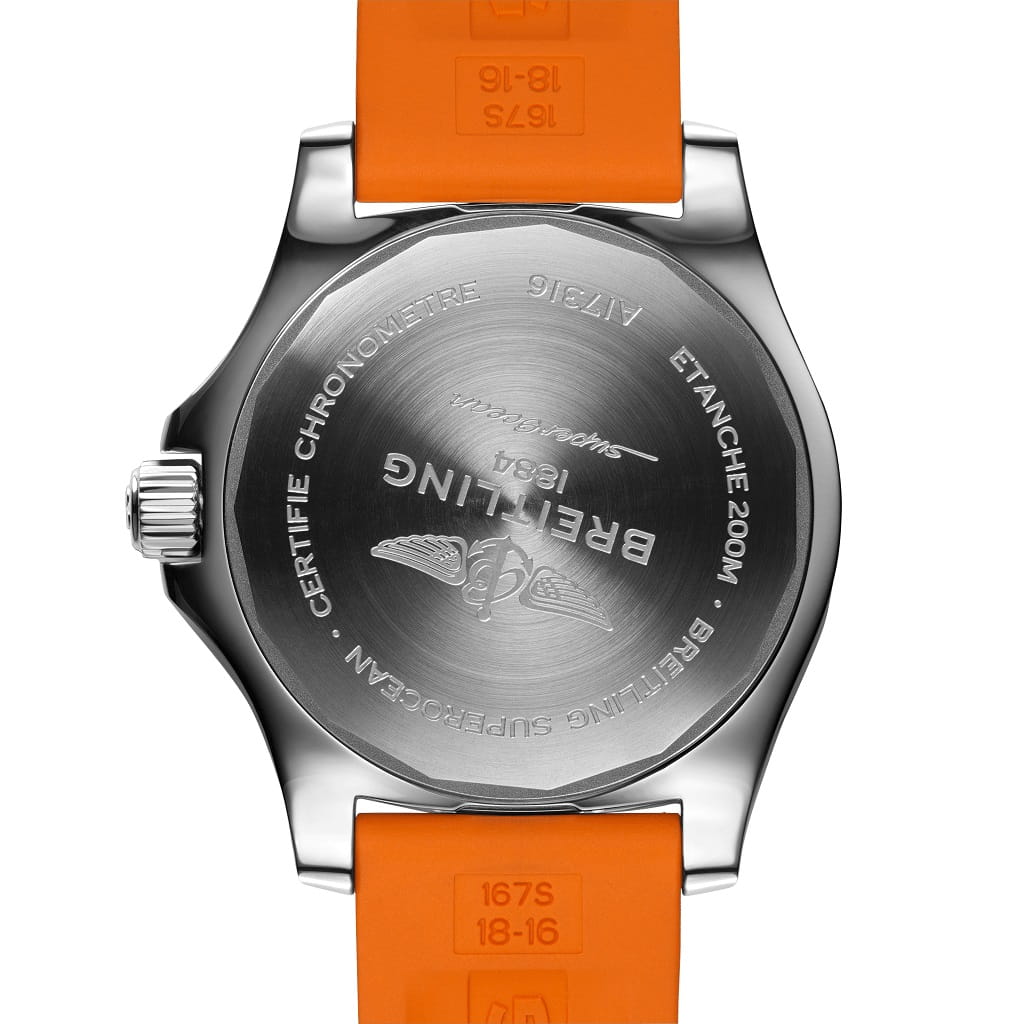 Класс водозащиты: 200 метров, позволит плавать, нырять и заниматься другими водными видами спорта. Корпус часов изготовлен из нержавеющей стали, серебристого цвета. Оранжевый каучуковый ремешок с классической застежкой из нержавеющей стали.