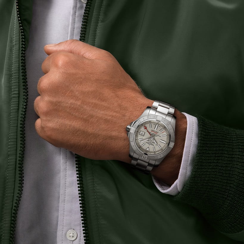 Модель Avenger II GMT отличается особой практичностью благодаря индикации в 24-часовом формате во втором часовом поясе и вращающемуся в оба направления безелю, который позволяет определять время в третьем часовом поясе. Надежная защита сертифицированного калибра с автоподзаводом обеспечивается за счет ультрапрочного стального корпуса, водонепроницаемость которого достигает 300 м (1000 футов), и продольного усиления конструкции часов.