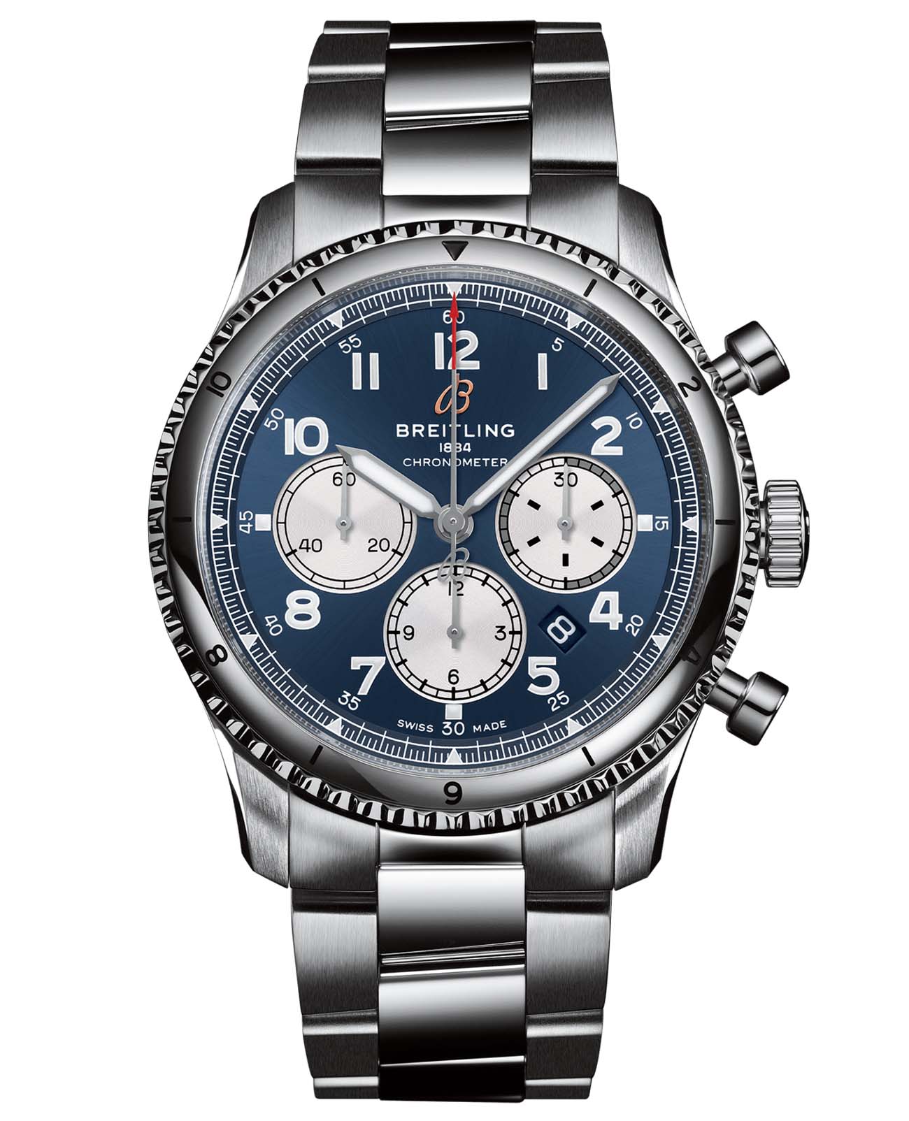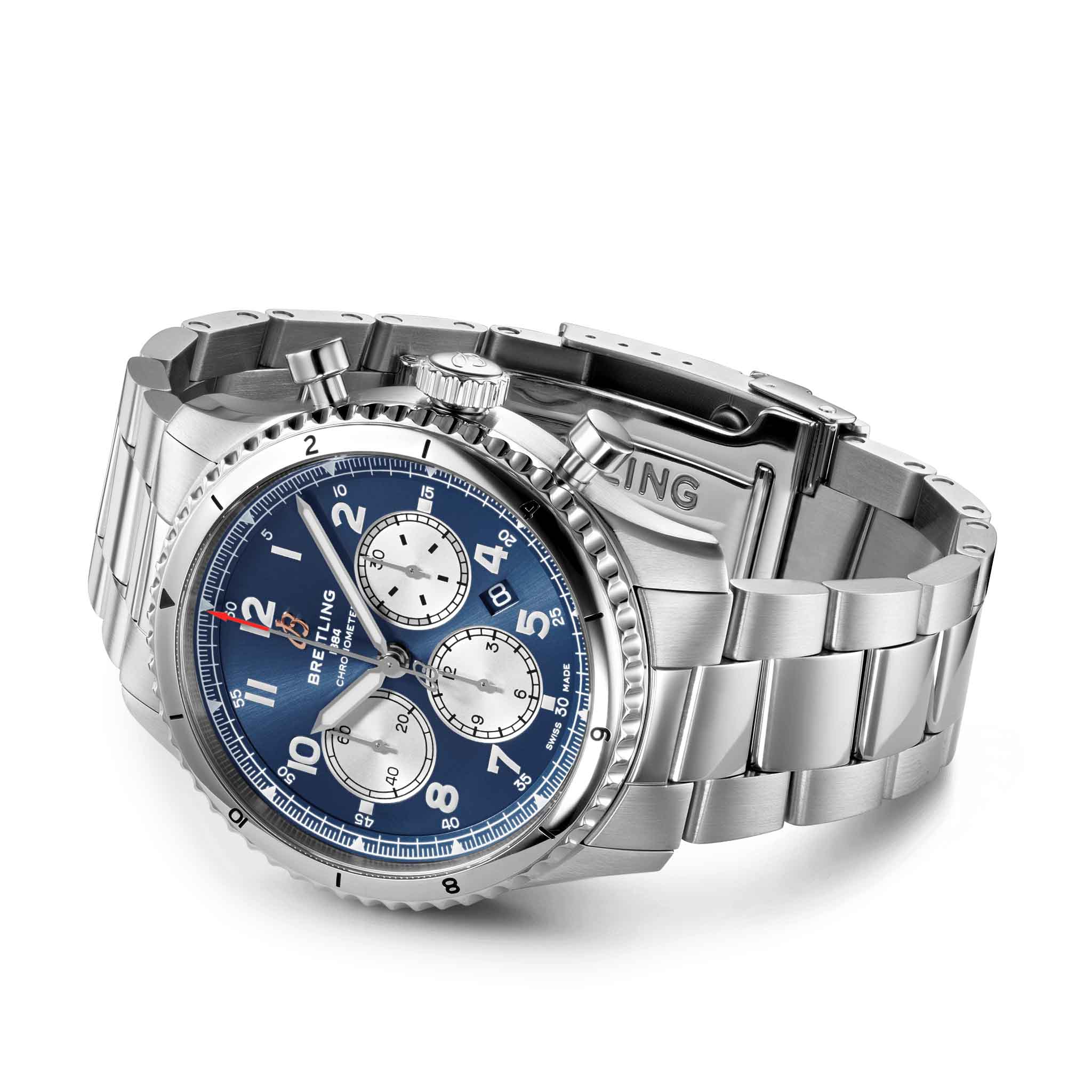 Хронограф Aviator 8 B01 43 оснащен калибром собственной мануфактуры Breitling Caliber 01. 43-миллиметровые часы с автоподзаводом с впечатляющим запасом хода более 70 часов. На дисплее установлены 30-минутный и 12-часовой счетчики, а также окно даты. Изюминкой этой новой линейки являются часы Aviator 8 B01 Chronograph 43, выполненные из стали с черным или синим циферблатом или из красного золота 18 карат с бронзовым циферблатом, каждый из которых имеет отличительные элементы дизайна в виде контрастных вспомогательных циферблатов. Хронометр, сертифицированный Сертификат COSCСертификат COSCОфициальный сертификат, подтверждающий то, что часы ходят с особо высокой точностью. Для получения документа часы подвергаются тестовым испытаниям, разработанным швейцарским институтом тестирования хронометров COSC. Допустимая норма для механических часов -4/+6 секунд в день, для кварцевых моделей +/- 0,07 секунд в день., представлен на стальном браслете или ремешке из кожи аллигатора и имеет прозрачную сапфировую заднюю крышку.