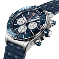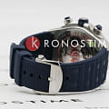 Корпус часов изготовлен из нержавеющей стали. Синий каучуковый ремешок со складной клипсой. Прозрачная задняя крышка корпуса из сапфирового стекла. Класс водозащиты: 200 метров.