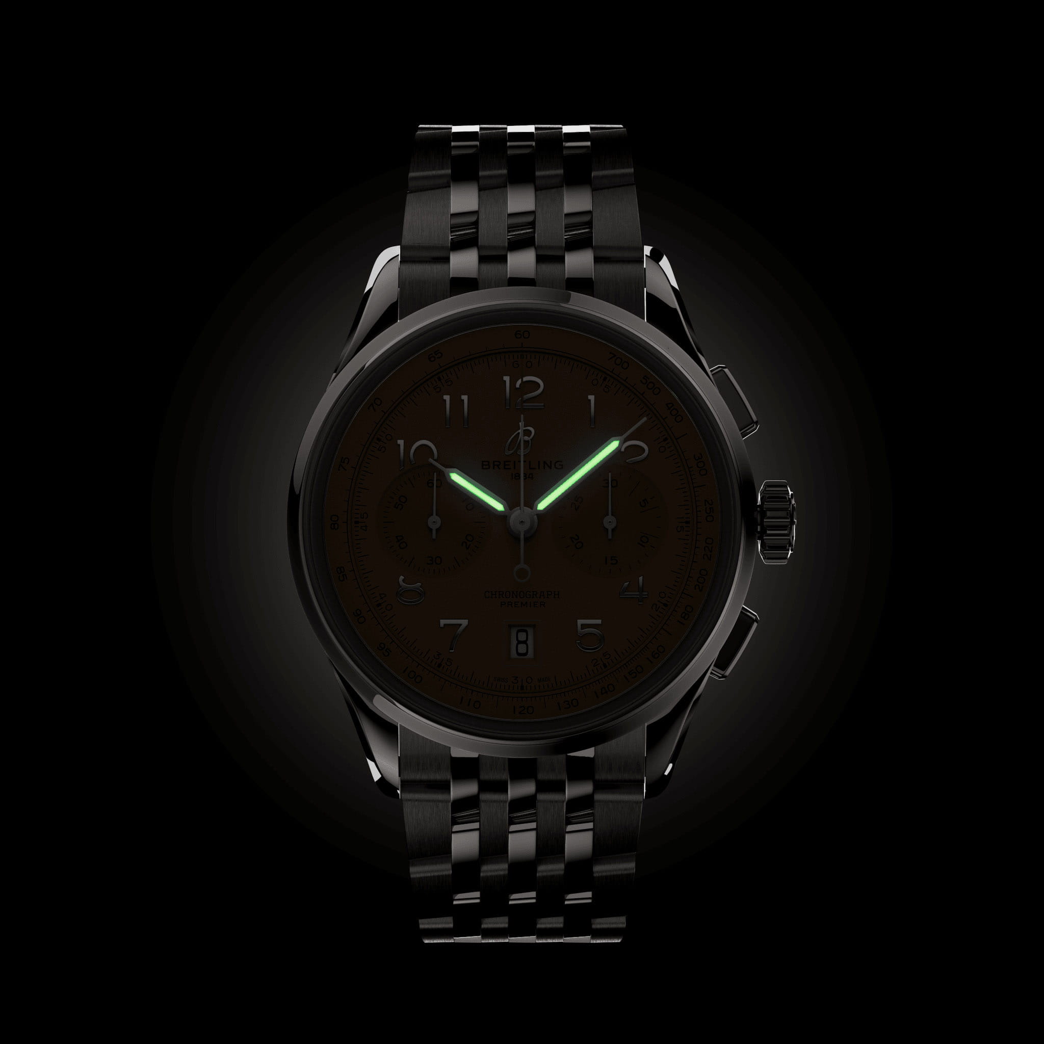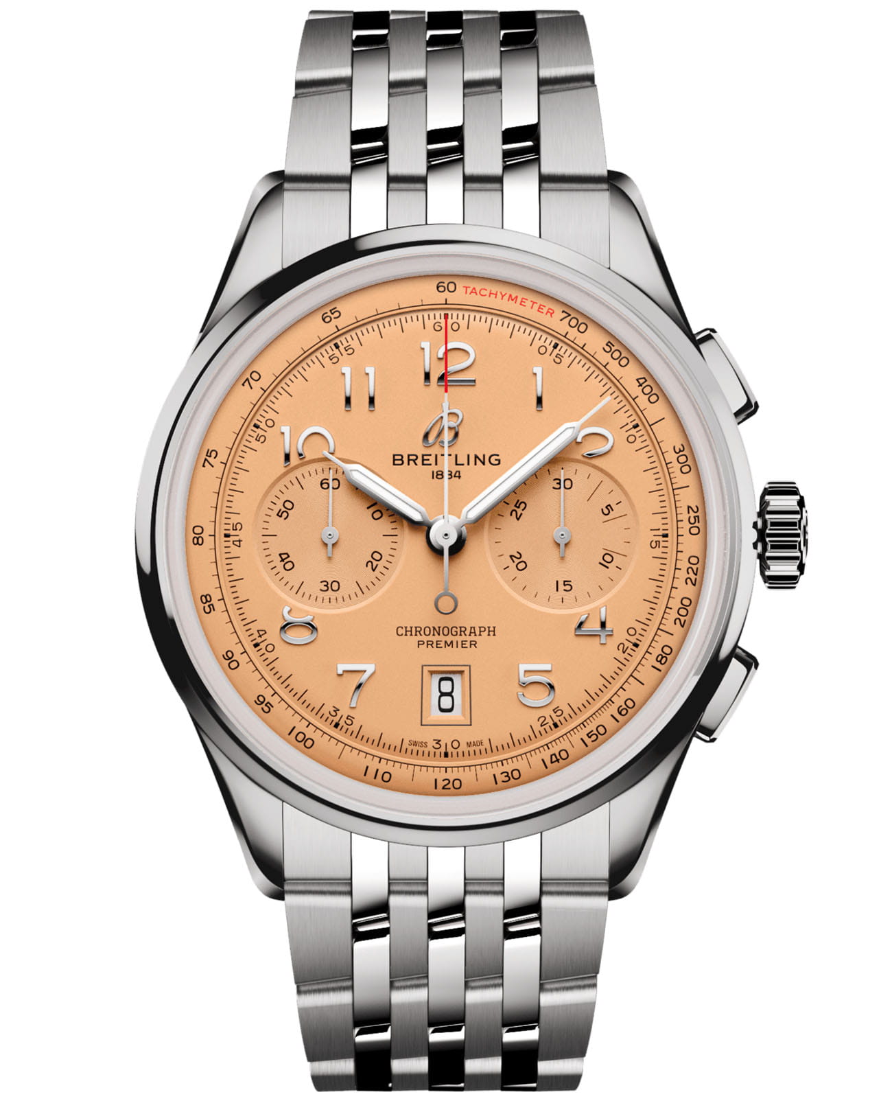 Мужские швейцарские часы-хронографХронографФункция позволяет измерять отрезки времени с особой точностью: часы, минуты, секунды. Верным признаком хронографа является наличие на циферблате 3 дополнительных окошек-счётчиков. с тахиметромТахиметрРазмеченная шкала, располагается на ободке или безеле часов. Тахиметр позволяет рассчитать скорость на определённом участке пути, расстояние измеряется в километрах или милях. Breitling Premier B01 Chronograph 42 AB0145331K1A1, механический механизм (автоматический калибр) с высокой точностью. Сапфировое стеклоСапфировое стеклоПрочный и надёжный материал из кристалла сапфира синтетического происхождения, характеризующийся особой твёрдостью и устойчивостью к царапинам и повреждениям. с антибликовым покрытием устойчивое к появлению царапин, обладающее высокой прозрачностью. Класс водозащиты: 100 метров, позволит плавать, нырять и заниматься другими водными видами спорта. Корпус часов изготовлен из стали. Стальной браслет с застёжкой-бабочкой с кнопкамиЗастёжка "бабочка"Такой вид застёжки дополняется предохранителями, помогающими избежать случайного раскрытия браслета. Обладают изящным исполнением. . Стрелки с люминесцентным покрытиемЛюминесцентное покрытиеПозволяет считывать показания времени в темноте. Производители наносят на стрелки, часовые индексы, безель или поверхность циферблата светонакопительный состав, дающий холодное свечение.. Окошко даты находится в положении 6 часов. СекундомерСекундомерСекундоме́р — прибор, способный измерять интервалы времени с точностью до долей секунды..