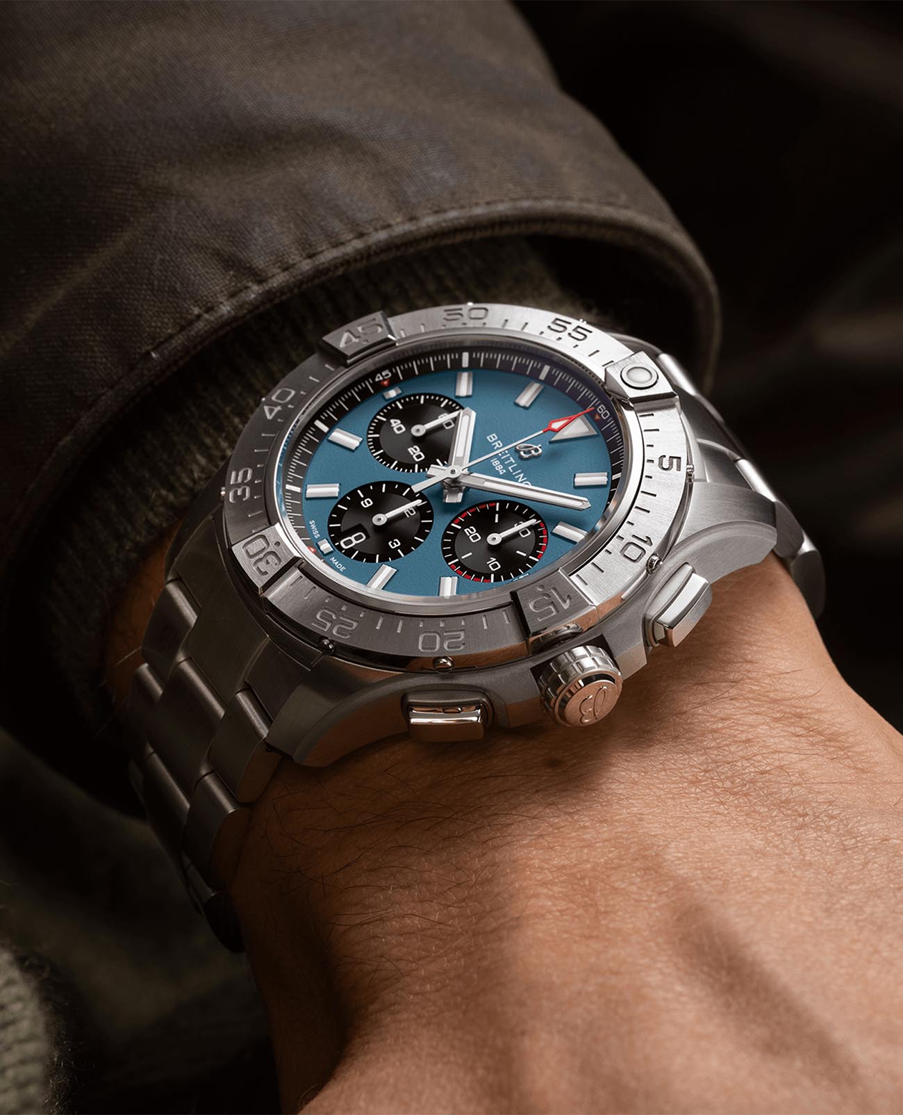 Мужские наручные часы c хронографомХронографФункция позволяет измерять отрезки времени с особой точностью: часы, минуты, секунды. Верным признаком хронографа является наличие на циферблате 3 дополнительных окошек-счётчиков. Breitling Avenger B01 Chronograph 44 AB0147101C1A1 с надёжным автоматическим механизмом. Корпус часов изготовлен из нержавеющей стали. Сапфировое стеклоСапфировое стеклоПрочный и надёжный материал из кристалла сапфира синтетического происхождения, характеризующийся особой твёрдостью и устойчивостью к царапинам и повреждениям. с антибликовым покрытием, устойчивое к мелким механическим повреждениям. Стальной браслет с раскладной застёжкойРаскладная застёжкаТакой тип застёжки используется только на браслетах из металла. Она никогда не раскрывается полностью, происходит разделение на 2 и более частей. Раскладывающая застёжка снизит вероятность потери часов к минимуму.. Стрелки и метки с люминесцентным покрытиемЛюминесцентное покрытиеПозволяет считывать показания времени в темноте. Производители наносят на стрелки, часовые индексы, безель или поверхность циферблата светонакопительный состав, дающий холодное свечение.. Однонаправленный безельБезельВнешний ободок, закрепляющий стекло. В спортивных часах так называется поворотное кольцо с делениями на циферблате, выполняет роль таймера – замеряет отрезки времени на шкале. Неподвижный безель – элемент декора. Однонаправленно вращающийся безель на дайверских часах позволяет фиксировать моменты погружения и выныривания на поверхность.. Класс водозащиты: 300 метров, позволит плавать, нырять и заниматься другими водными видами спорта.