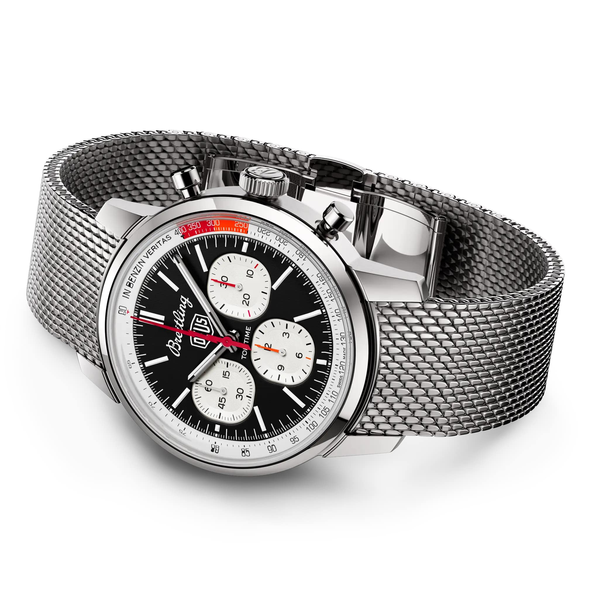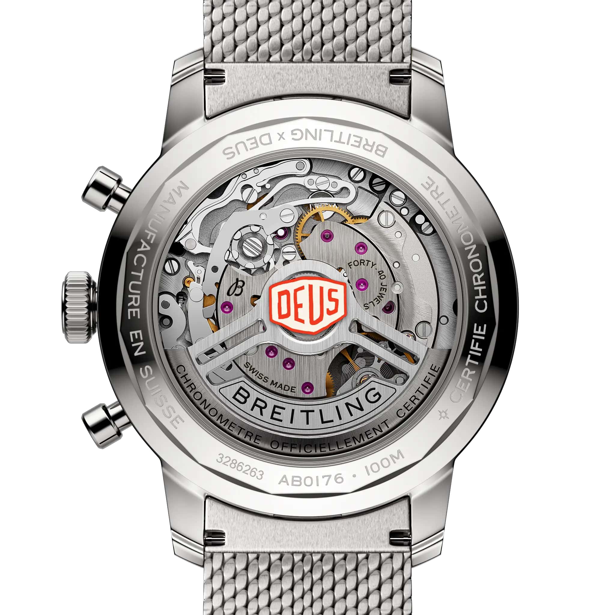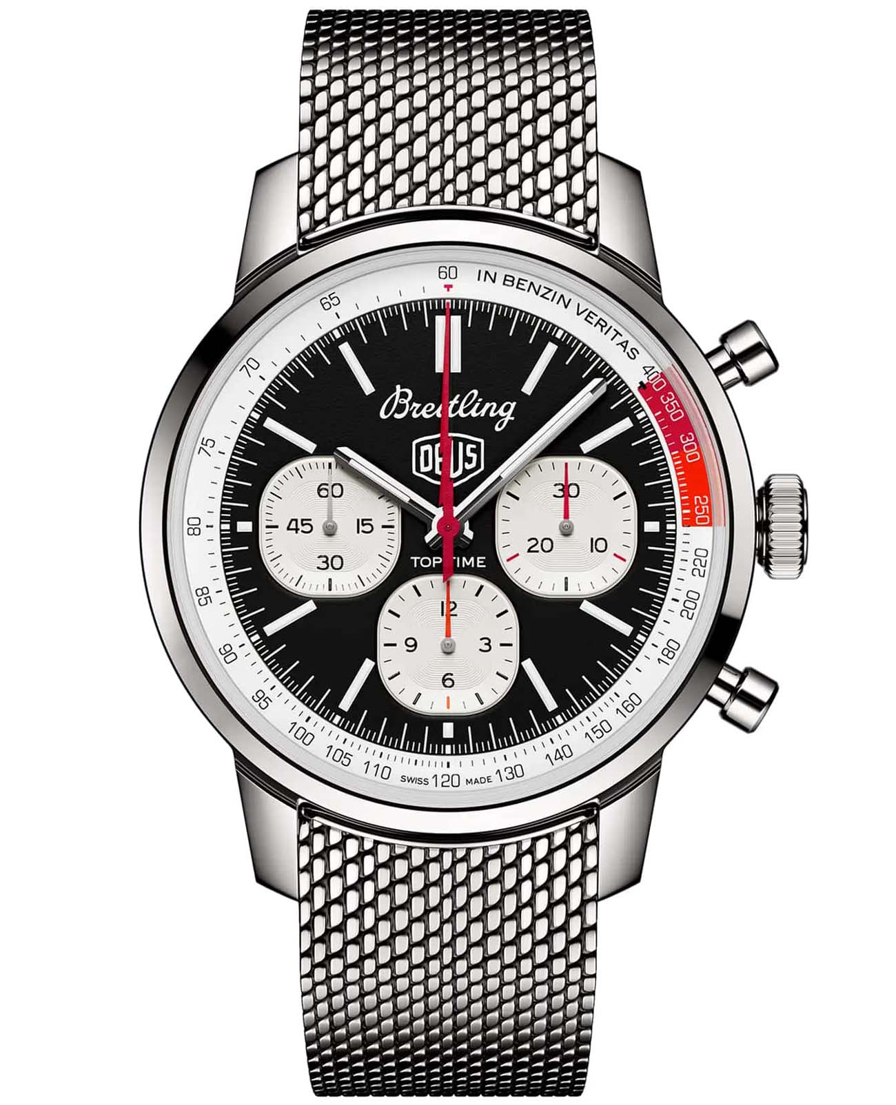 Мужские швейцарские часы-хронографХронографФункция позволяет измерять отрезки времени с особой точностью: часы, минуты, секунды. Верным признаком хронографа является наличие на циферблате 3 дополнительных окошек-счётчиков. с тахиметромТахиметрРазмеченная шкала, располагается на ободке или безеле часов. Тахиметр позволяет рассчитать скорость на определённом участке пути, расстояние измеряется в километрах или милях. Breitling Top Time B01 Deus AB01765A1B1A1, механический механизм (автоматический калибр) с высокой точностью. Сапфировое стеклоСапфировое стеклоПрочный и надёжный материал из кристалла сапфира синтетического происхождения, характеризующийся особой твёрдостью и устойчивостью к царапинам и повреждениям. устойчивое к появлению царапин, обладающее высокой прозрачностью. Корпус часов изготовлен из нержавеющей стали. Стальной браслет миланского плетения на раскладном замкеРаскладной замокДанный вариант застежки используется только на часах с металлическим браслетом. Отличительная особенность такого крепления в том, что длина браслета становится универсальной и вы можете самостоятельно отрегулировать нужный вам размер – застежка просто двигается по браслету часов.. Класс водозащиты: 100 метров, позволит плавать, нырять и заниматься другими водными видами спорта. Стрелки и метки с люминесцентным покрытиемЛюминесцентное покрытиеПозволяет считывать показания времени в темноте. Производители наносят на стрелки, часовые индексы, безель или поверхность циферблата светонакопительный состав, дающий холодное свечение..