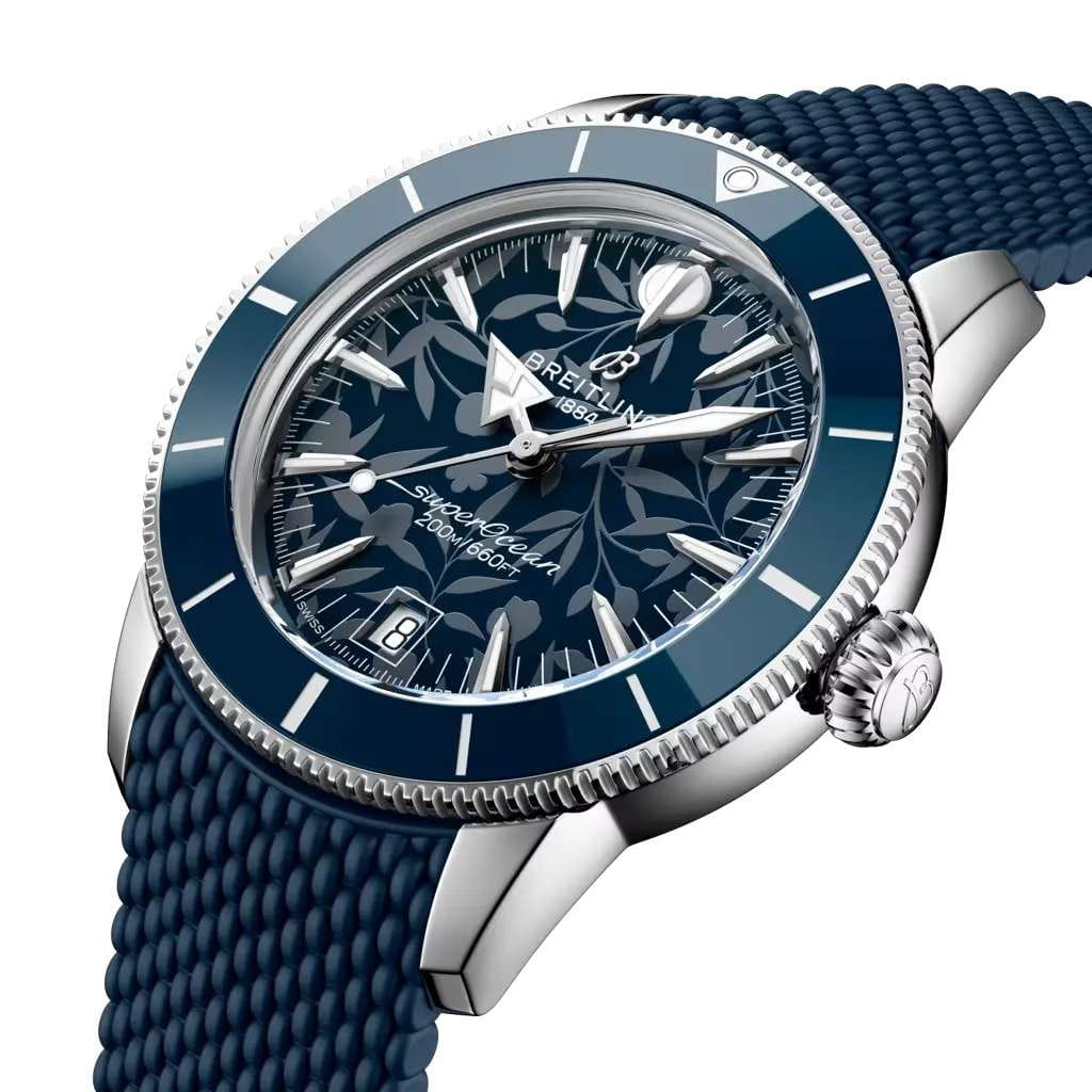 Мужские механические часы Breitling Superocean Heritage B31 Automatic 40 «Kelly Slater Limited Edition» AB31101A1C1S1 — это стильное сочетание элегантности и современного дизайна. Корпус из нержавеющей стали диаметром 40 мм, идеально сбалансирован и элегантен. На циферблате изображен узор из тропической листвы, передающий атмосферу гавайского рая. Сапфировое стеклоСапфировое стеклоПрочный и надёжный материал из кристалла сапфира синтетического происхождения, характеризующийся особой твёрдостью и устойчивостью к царапинам и повреждениям. с антибликовым покрытием защищает циферблат от царапин и обеспечивает отличную читаемость при любом освещении. Каучуковый ремешок на раскладной застёжкеРаскладная застёжкаТакой тип застёжки используется только на браслетах из металла. Она никогда не раскрывается полностью, происходит разделение на 2 и более частей. Раскладывающая застёжка снизит вероятность потери часов к минимуму. идеально дополняют дизайн часов, обеспечивая комфортное ношение. Стрелки и метки на циферблате имеют люминесцентное покрытиеЛюминесцентное покрытиеПозволяет считывать показания времени в темноте. Производители наносят на стрелки, часовые индексы, безель или поверхность циферблата светонакопительный состав, дающий холодное свечение. Super-LumiNova® позволяющее легко определять время даже в темноте. Вращающийся безельБезельВнешний ободок, закрепляющий стекло. В спортивных часах так называется поворотное кольцо с делениями на циферблате, выполняет роль таймера – замеряет отрезки времени на шкале. Неподвижный безель – элемент декора. Однонаправленно вращающийся безель на дайверских часах позволяет фиксировать моменты погружения и выныривания на поверхность. с керамической вставкой обеспечивает исключительную устойчивость к царапинам. Часы обладают впечатляющей водонепроницаемостью до 20 бар (200 метров), что делает их идеальными для плавания, ныряния и погружений с аквалангом. Окошко даты находится в положении 6 часов. Прочная конструкция часов и высокопроизводительный механизм делают их идеальным спутником для любителей активного отдыха. В коллекции представлен автоматический механизм B31, первый эксклюзивный калибр Breitling с тремя стрелками.