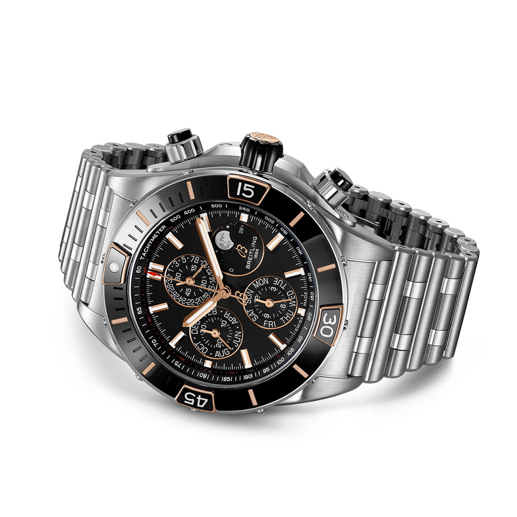 «Реактивные» часы Breitling с четырехлетним календарем на все случаи жизни. Часы Super Chronomat созданы по мотивам оригинальной модели Chronomat 80-х годов, которая была разработана компанией Breitling для асов пилотажной эскадрильи. Обладающие наиболее смелым дизайном из всех моделей коллекции Chronomat, часы Super Chronomat отличаются кармической инкрустацией на безеле, кнопках хронографа и заводной головке.