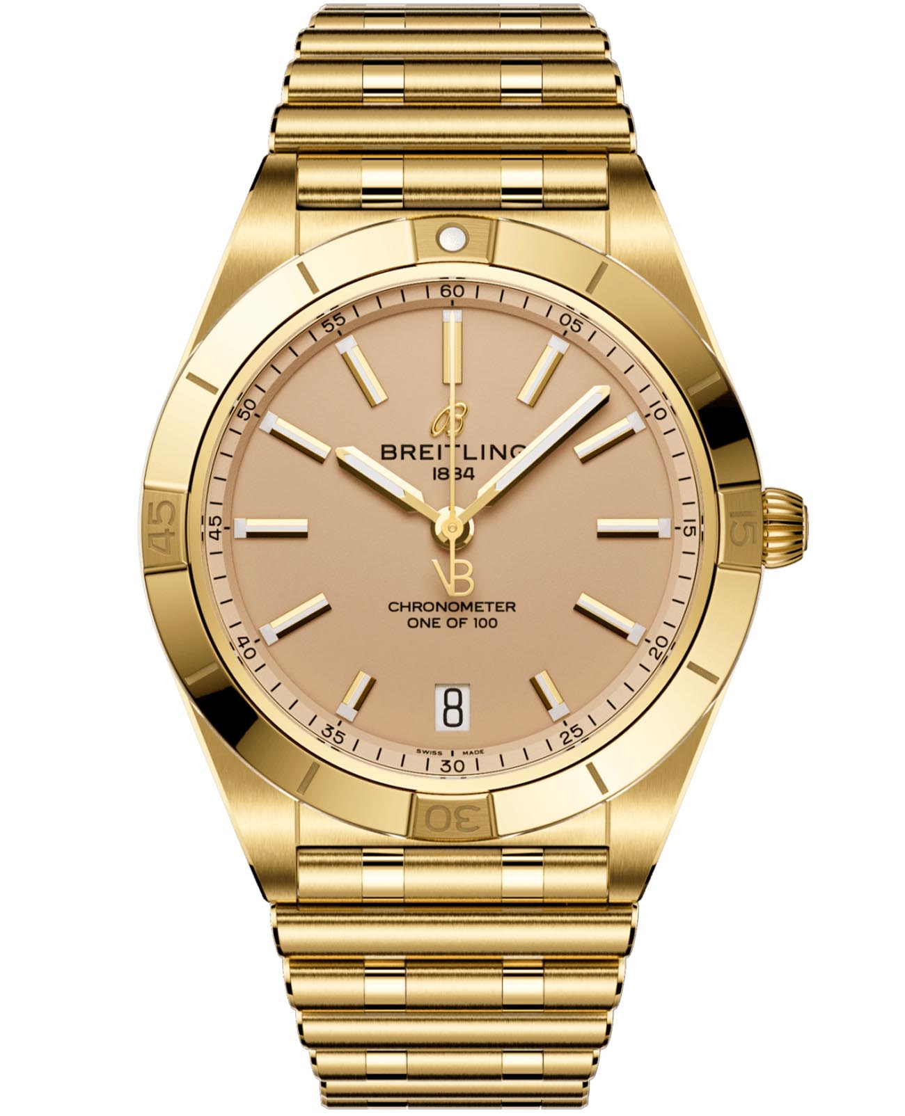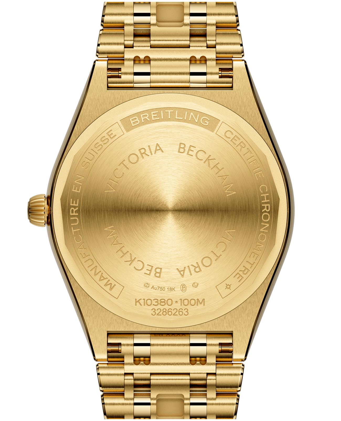 Женские швейцарские часы Breitling Chronomat Automatic 36 Victoria Beckham K103801A1A1K1 с надёжным автоматическим механизмом, выпущенные лимитированной серией всего из 1500 экземпляров в сотрудничестве с модным домом Victoria Beckham. Сапфировое стеклоСапфировое стеклоПрочный и надёжный материал из кристалла сапфира синтетического происхождения, характеризующийся особой твёрдостью и устойчивостью к царапинам и повреждениям. устойчивое к мелким механическим повреждениям. Корпус и браслет часов изготовлены из желтого 18-каратного золота18-каратное золотоОбозначение по каратной системе пробирования, оно показывает, сколько драгоценного металла содержится в изделии. 18 карат - в составе 75% чистого золота, соответствует 750 пробе.