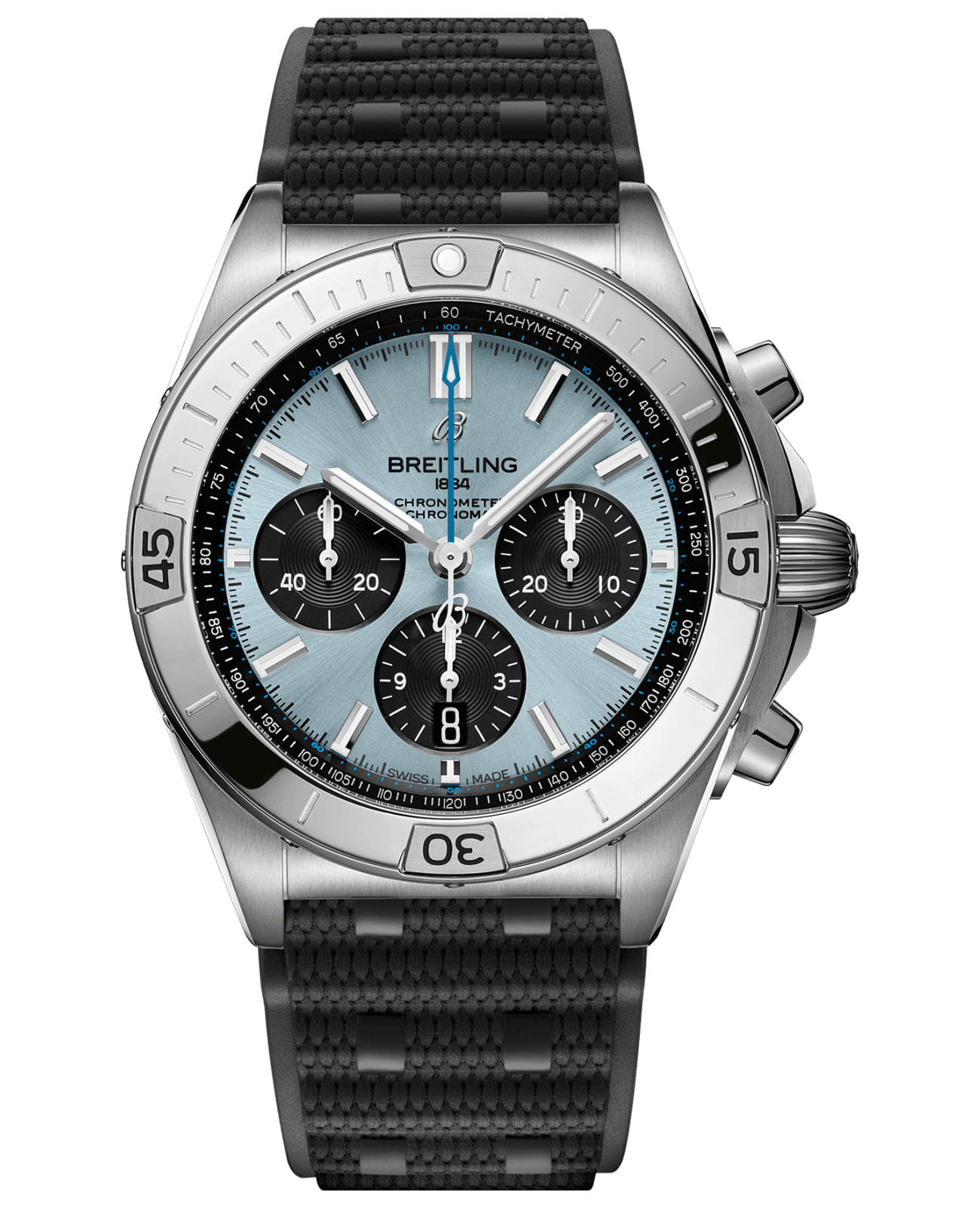 Мужские механические часы-хронографХронографФункция позволяет измерять отрезки времени с особой точностью: часы, минуты, секунды. Верным признаком хронографа является наличие на циферблате 3 дополнительных окошек-счётчиков. Breitling Chronomat B01 42 PB0134101C1S2 с сапфировым стекломСапфировое стеклоПрочный и надёжный материал из кристалла сапфира синтетического происхождения, характеризующийся особой твёрдостью и устойчивостью к царапинам и повреждениям.. Корпус часов изготовлен из нержавеющей стали и платины. Класс водозащиты: 200 метров, позволит плавать, нырять и заниматься другими водными видами спорта. Стрелки и метки с люминесцентным покрытиемЛюминесцентное покрытиеПозволяет считывать показания времени в темноте. Производители наносят на стрелки, часовые индексы, безель или поверхность циферблата светонакопительный состав, дающий холодное свечение.. Каучуковый ремешок на раскладной застёжкеРаскладная застёжкаТакой тип застёжки используется только на браслетах из металла. Она никогда не раскрывается полностью, происходит разделение на 2 и более частей. Раскладывающая застёжка снизит вероятность потери часов к минимуму..