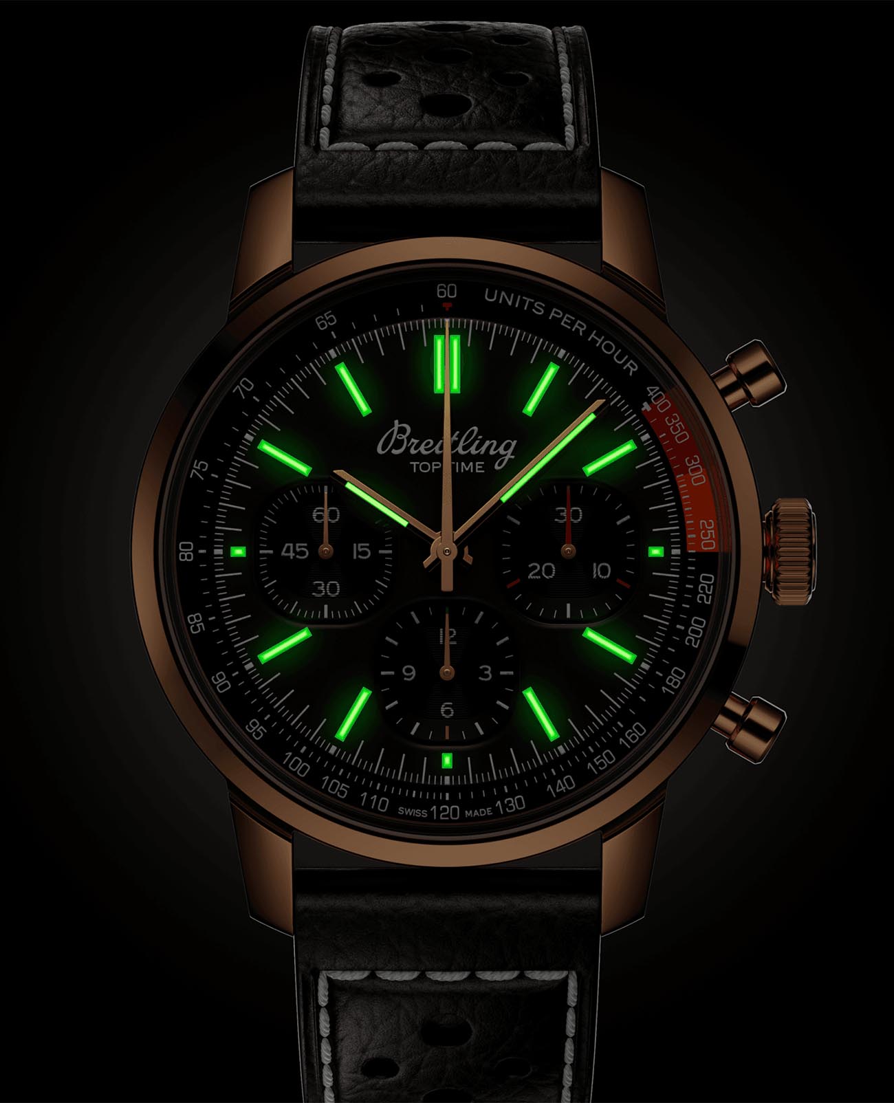 Мужские швейцарские часы-хронографХронографФункция позволяет измерять отрезки времени с особой точностью: часы, минуты, секунды. Верным признаком хронографа является наличие на циферблате 3 дополнительных окошек-счётчиков. с тахиметромТахиметрРазмеченная шкала, располагается на ободке или безеле часов. Тахиметр позволяет рассчитать скорость на определённом участке пути, расстояние измеряется в километрах или милях. Breitling Top Time B01 RB01761A1Q1X1, механический механизм (автоматический калибр) с высокой точностью. Сапфировое стеклоСапфировое стеклоПрочный и надёжный материал из кристалла сапфира синтетического происхождения, характеризующийся особой твёрдостью и устойчивостью к царапинам и повреждениям. устойчивое к появлению царапин, обладающее высокой прозрачностью. Корпус часов изготовлен из красного 18-каратного золота18-каратное золотоОбозначение по каратной системе пробирования, оно показывает, сколько драгоценного металла содержится в изделии. 18 карат - в составе 75% чистого золота, соответствует 750 пробе.