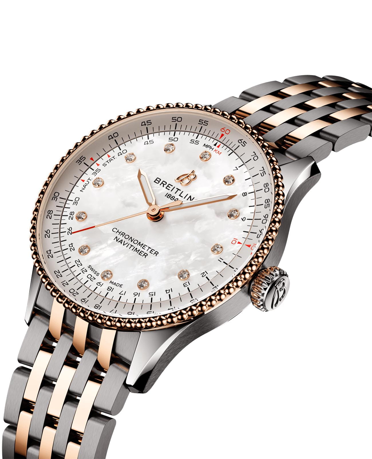 Швейцарские унисекс часы-хронометр Breitling Navitimer Automatic 36 U17327211A1U1, механический механизм (автоматический калибр) с высокой точностью. Сапфировое стеклоСапфировое стеклоПрочный и надёжный материал из кристалла сапфира синтетического происхождения, характеризующийся особой твёрдостью и устойчивостью к царапинам и повреждениям. устойчивое к появлению царапин, обладающее высокой прозрачностью. Класс водозащиты: 30 метров, позволит защитить корпус от случайных брызг или капель дождя. Корпус часов изготовлен из нержавеющей стали. Браслет из нержавеющей стали и красного 18-каратного золота18-каратное золотоОбозначение по каратной системе пробирования, оно показывает, сколько драгоценного металла содержится в изделии. 18 карат - в составе 75% чистого золота, соответствует 750 пробе.
