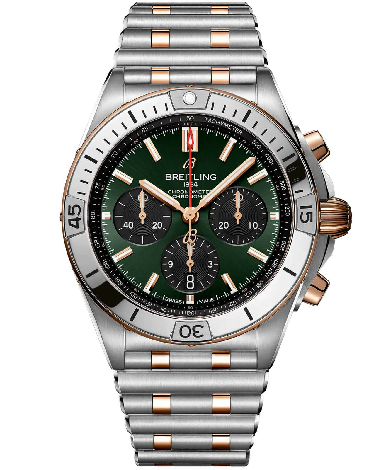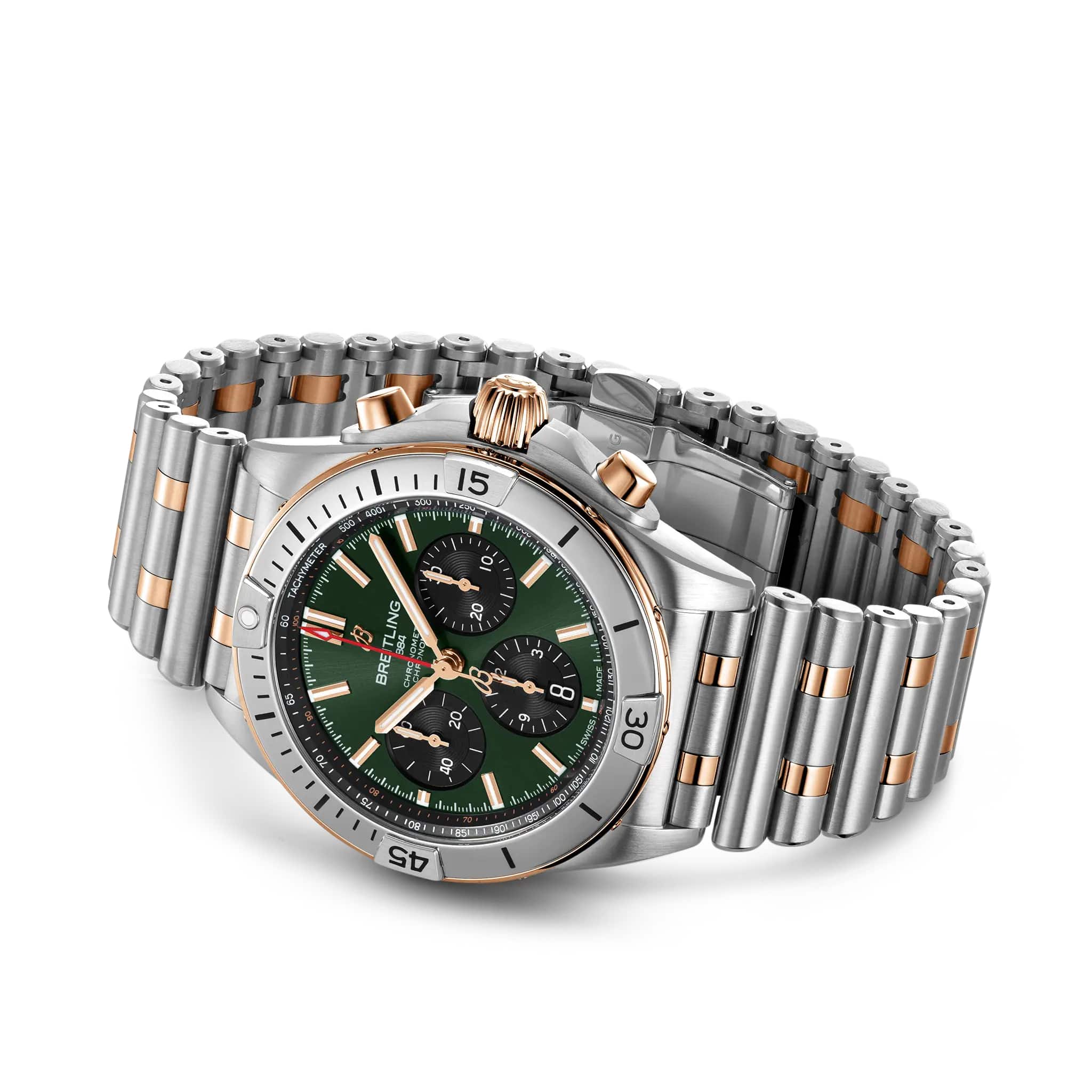 Мужские швейцарские часы-хронографХронографФункция позволяет измерять отрезки времени с особой точностью: часы, минуты, секунды. Верным признаком хронографа является наличие на циферблате 3 дополнительных окошек-счётчиков. с секундомеромСекундомерСекундоме́р — прибор, способный измерять интервалы времени с точностью до долей секунды. Breitling Chronomat B01 42 UB0134131L1U1, механический механизм (автоматический калибр) с высокой точностью. Сапфировое стеклоСапфировое стеклоПрочный и надёжный материал из кристалла сапфира синтетического происхождения, характеризующийся особой твёрдостью и устойчивостью к царапинам и повреждениям. устойчивое к появлению царапин, обладающее высокой прозрачностью. Класс водозащиты: 200 метров, позволит плавать, нырять и заниматься другими водными видами спорта. Корпус часов изготовлен из нержавеющей стали. Стальной БезельБезельВнешний ободок, закрепляющий стекло. В спортивных часах так называется поворотное кольцо с делениями на циферблате, выполняет роль таймера – замеряет отрезки времени на шкале. Неподвижный безель – элемент декора. Однонаправленно вращающийся безель на дайверских часах позволяет фиксировать моменты погружения и выныривания на поверхность. с 18-каратным золотом18-каратное золотоОбозначение по каратной системе пробирования, оно показывает, сколько драгоценного металла содержится в изделии. 18 карат - в составе 75% чистого золота, соответствует 750 пробе.