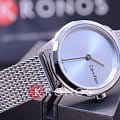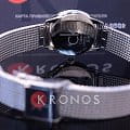 Стильным элементом стал стальной браслет плетения Mesh, общее классическое оформление отличается элегантностью. Привлекательно выглядит минималистичный серебристый циферблат «солнечные лучи». Швейцарский кварцевый калибр от ETA. Минеральное стекло. Водонепроницаемость до 3 бар.