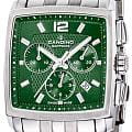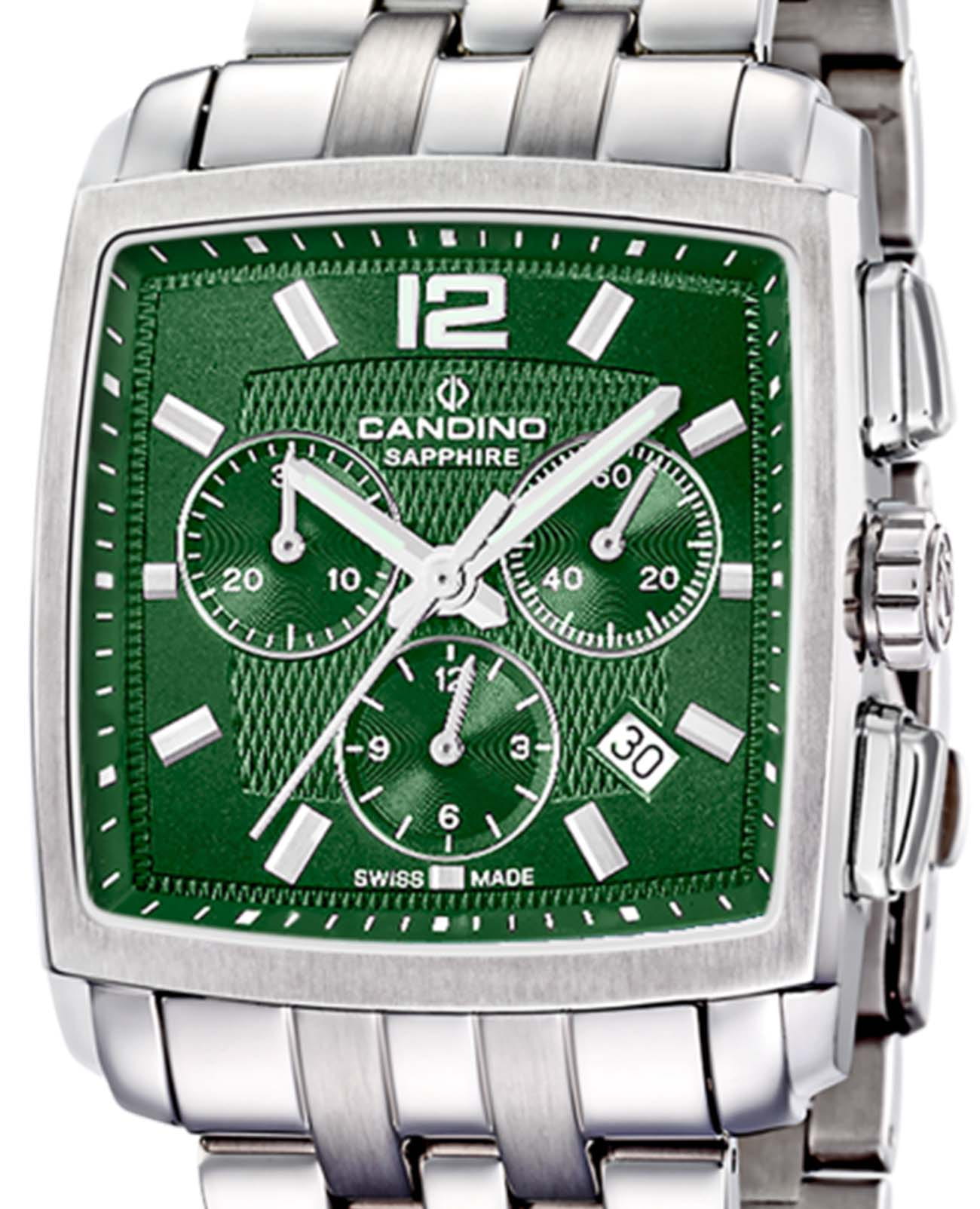 Candino C4374/K, мужские кварцевые часы-хронограф. Квадратный корпус 36×36 мм, толщина 11 мм, корпус и браслет из нержавеющей стали 316L. Зелёный циферблат с тремя субциферблатами хронографа, индикацией 12/24 часа и датой. Центральные стрелки и метки с люминисцентным покрытиемЛюминесцентное покрытиеПозволяет считывать показания времени в темноте. Производители наносят на стрелки, часовые индексы, безель или поверхность циферблата светонакопительный состав, дающий холодное свечение. — удобное считывание при слабом освещении. Швейцарский механизм с функцией секундомера. Стекло — сапфировоеСапфировое стеклоПрочный и надёжный материал из кристалла сапфира синтетического происхождения, характеризующийся особой твёрдостью и устойчивостью к царапинам и повреждениям., устойчивое к царапинам. Водозащита 50 м — защита от дождя и брызг. Стальной браслет шириной 23 мм с раскладной застёжкойРаскладная застёжкаТакой тип застёжки используется только на браслетах из металла. Она никогда не раскрывается полностью, происходит разделение на 2 и более частей. Раскладывающая застёжка снизит вероятность потери часов к минимуму.. Компактный квадратный формат, хронограф и швейцарская точность - практичный выбор для тех, кто ценит функциональность без визуальной перегруженности.