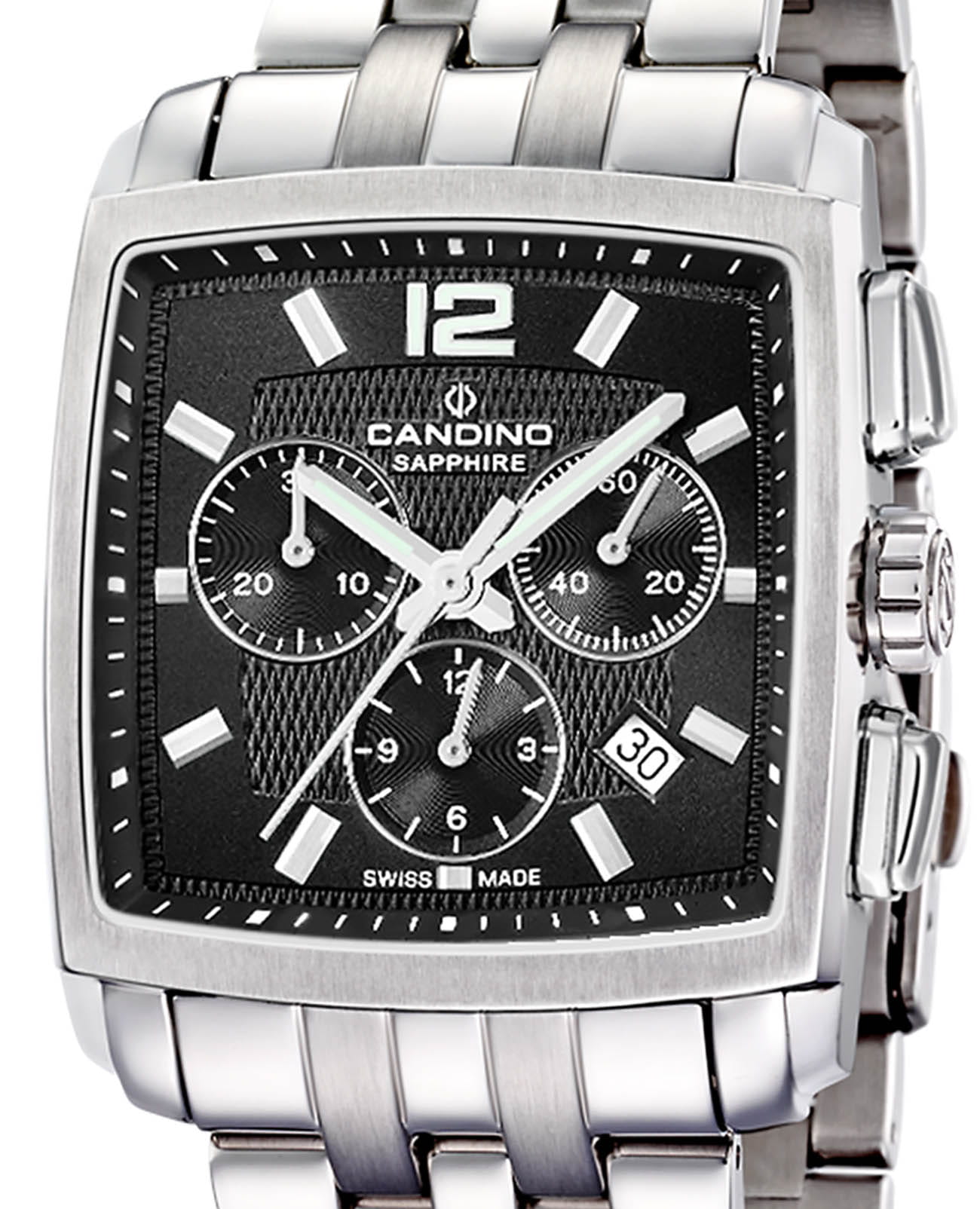 Candino C4374/M, мужские кварцевые часы-хронограф. Квадратный корпус 36×36 мм, толщина 11 мм, корпус и браслет из нержавеющей стали 316L. Чёрный циферблат с тремя субциферблатами хронографа, индикацией 12/24 часа и датой. Центральные стрелки и метки с люминисцентным покрытиемЛюминесцентное покрытиеПозволяет считывать показания времени в темноте. Производители наносят на стрелки, часовые индексы, безель или поверхность циферблата светонакопительный состав, дающий холодное свечение. — удобное считывание при слабом освещении. Швейцарский механизм с функцией секундомера. Стекло — сапфировоеСапфировое стеклоПрочный и надёжный материал из кристалла сапфира синтетического происхождения, характеризующийся особой твёрдостью и устойчивостью к царапинам и повреждениям., устойчивое к царапинам. Водозащита 50 м — защита от дождя и брызг. Стальной браслет шириной 23 мм с раскладной застёжкойРаскладная застёжкаТакой тип застёжки используется только на браслетах из металла. Она никогда не раскрывается полностью, происходит разделение на 2 и более частей. Раскладывающая застёжка снизит вероятность потери часов к минимуму.. Компактный квадратный формат, хронограф и швейцарская точность - практичный выбор для тех, кто ценит функциональность без визуальной перегруженности.