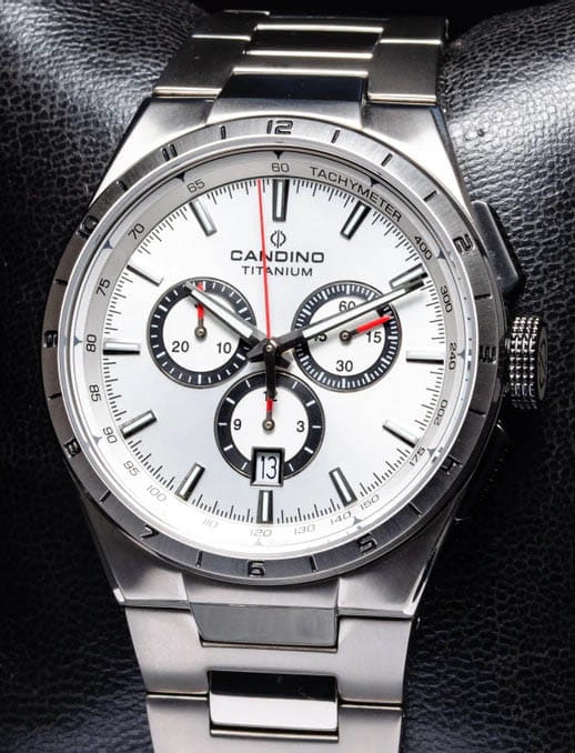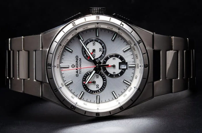 Швейцарские мужские наручные часы-хронографХронографФункция позволяет измерять отрезки времени с особой точностью: часы, минуты, секунды. Верным признаком хронографа является наличие на циферблате 3 дополнительных окошек-счётчиков. с секундомеромСекундомерСекундоме́р — прибор, способный измерять интервалы времени с точностью до долей секунды. Candino Titanium Chrono C4603/A, кварцевый механизм с высокой точностью. Сапфировое стеклоСапфировое стеклоПрочный и надёжный материал из кристалла сапфира синтетического происхождения, характеризующийся особой твёрдостью и устойчивостью к царапинам и повреждениям. устойчивое к появлению царапин, обладающее высокой прозрачностью. Класс водозащиты: 100 метров, позволит плавать, нырять и заниматься другими водными видами спорта. Корпус часов изготовлен из титана. Титановый браслет на раскладной застёжкеРаскладная застёжкаТакой тип застёжки используется только на браслетах из металла. Она никогда не раскрывается полностью, происходит разделение на 2 и более частей. Раскладывающая застёжка снизит вероятность потери часов к минимуму.. Стрелки и метки с люминесцентным покрытиемЛюминесцентное покрытиеПозволяет считывать показания времени в темноте. Производители наносят на стрелки, часовые индексы, безель или поверхность циферблата светонакопительный состав, дающий холодное свечение.. Окошко даты находится в положении 6 часов.