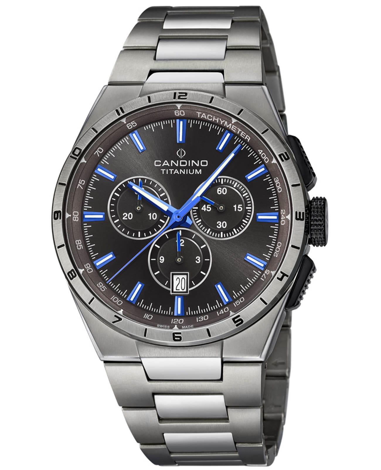 Швейцарские мужские наручные часы-хронографХронографФункция позволяет измерять отрезки времени с особой точностью: часы, минуты, секунды. Верным признаком хронографа является наличие на циферблате 3 дополнительных окошек-счётчиков. с секундомеромСекундомерСекундоме́р — прибор, способный измерять интервалы времени с точностью до долей секунды. Candino Titanium Chrono C4603/E, кварцевый механизм с высокой точностью. Сапфировое стеклоСапфировое стеклоПрочный и надёжный материал из кристалла сапфира синтетического происхождения, характеризующийся особой твёрдостью и устойчивостью к царапинам и повреждениям. устойчивое к появлению царапин, обладающее высокой прозрачностью. Класс водозащиты: 100 метров, позволит плавать, нырять и заниматься другими водными видами спорта. Корпус часов изготовлен из титана. Титановый браслет на раскладной застёжкеРаскладная застёжкаТакой тип застёжки используется только на браслетах из металла. Она никогда не раскрывается полностью, происходит разделение на 2 и более частей. Раскладывающая застёжка снизит вероятность потери часов к минимуму.. Стрелки и метки с люминесцентным покрытиемЛюминесцентное покрытиеПозволяет считывать показания времени в темноте. Производители наносят на стрелки, часовые индексы, безель или поверхность циферблата светонакопительный состав, дающий холодное свечение.. Окошко даты находится в положении 6 часов.