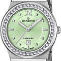 Женские кварцевые часы Candino из коллекции Lady Elegance — это элегантный аксессуар швейцарского производства, сочетающий изысканный дизайн и надёжность. Корпус круглой формы выполнен из стали серебряного цвета и защищён сапфировым стекломСапфировое стеклоПрочный и надёжный материал из кристалла сапфира синтетического происхождения, характеризующийся особой твёрдостью и устойчивостью к царапинам и повреждениям.. Безель украшен кристаллами, подчёркивая роскошь модели. Циферблат зелёного цвета оформлен точками в качестве индикации, окошко даты расположено на отметке 6 часов. Стрелки и метки оснащены люминесцентным покрытиемЛюминесцентное покрытиеПозволяет считывать показания времени в темноте. Производители наносят на стрелки, часовые индексы, безель или поверхность циферблата светонакопительный состав, дающий холодное свечение. Luminova, обеспечивающим хорошую читаемость в темноте. Браслет из стали серебряного цвета фиксируется на раскладной застёжкеРаскладная застёжкаТакой тип застёжки используется только на браслетах из металла. Она никогда не раскрывается полностью, происходит разделение на 2 и более частей. Раскладывающая застёжка снизит вероятность потери часов к минимуму.. Водонепроницаемость составляет 50 WR, что позволяет использовать часы в повседневных условиях, защищая от случайных брызг и капель дождя. Модель идеально подходит для повседневного ношения, подчёркивая утончённый стиль и женственность.