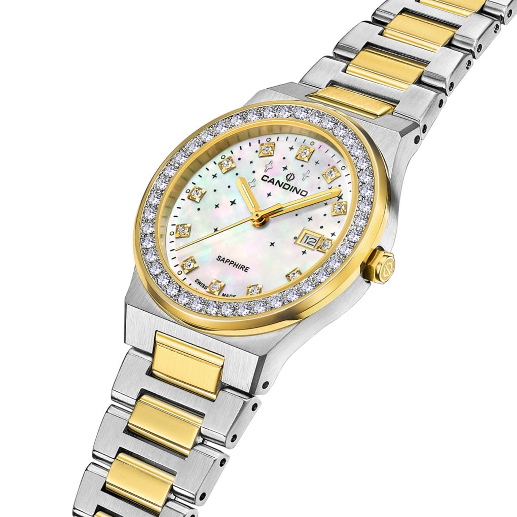 Женские наручные часы Candino Lady Elegance Sparkling Date C4750/1 с надёжным кварцевым механизмом. Корпус и браслет часов изготовлены из нержавеющей стали. Сапфировое стеклоСапфировое стеклоПрочный и надёжный материал из кристалла сапфира синтетического происхождения, характеризующийся особой твёрдостью и устойчивостью к царапинам и повреждениям. повышенной прозрачности, устойчивое к мелким механическим повреждениям. Стальной браслет с частичным PVD-покрытиемPVDУльтратонкое покрытие наносится в технике вакуумного напыления, сочетает в себе нитрид титана особой прочности со слоем золота или оксида хрома. Несёт в себе декоративную или защитную функцию. на раскладной застёжкеРаскладная застёжкаТакой тип застёжки используется только на браслетах из металла. Она никогда не раскрывается полностью, происходит разделение на 2 и более частей. Раскладывающая застёжка снизит вероятность потери часов к минимуму.. Стрелки и метки с люминесцентным покрытиемЛюминесцентное покрытиеПозволяет считывать показания времени в темноте. Производители наносят на стрелки, часовые индексы, безель или поверхность циферблата светонакопительный состав, дающий холодное свечение.. Перламутровый циферблат с россыпью звёзд и безельБезельВнешний ободок, закрепляющий стекло. В спортивных часах так называется поворотное кольцо с делениями на циферблате, выполняет роль таймера – замеряет отрезки времени на шкале. Неподвижный безель – элемент декора. Однонаправленно вращающийся безель на дайверских часах позволяет фиксировать моменты погружения и выныривания на поверхность. инкрустированы цирконами. Класс водозащиты: 50 метров, позволит защитить корпус от случайных брызг или капель дождя. Окошко даты находится в положении 3 часа.
