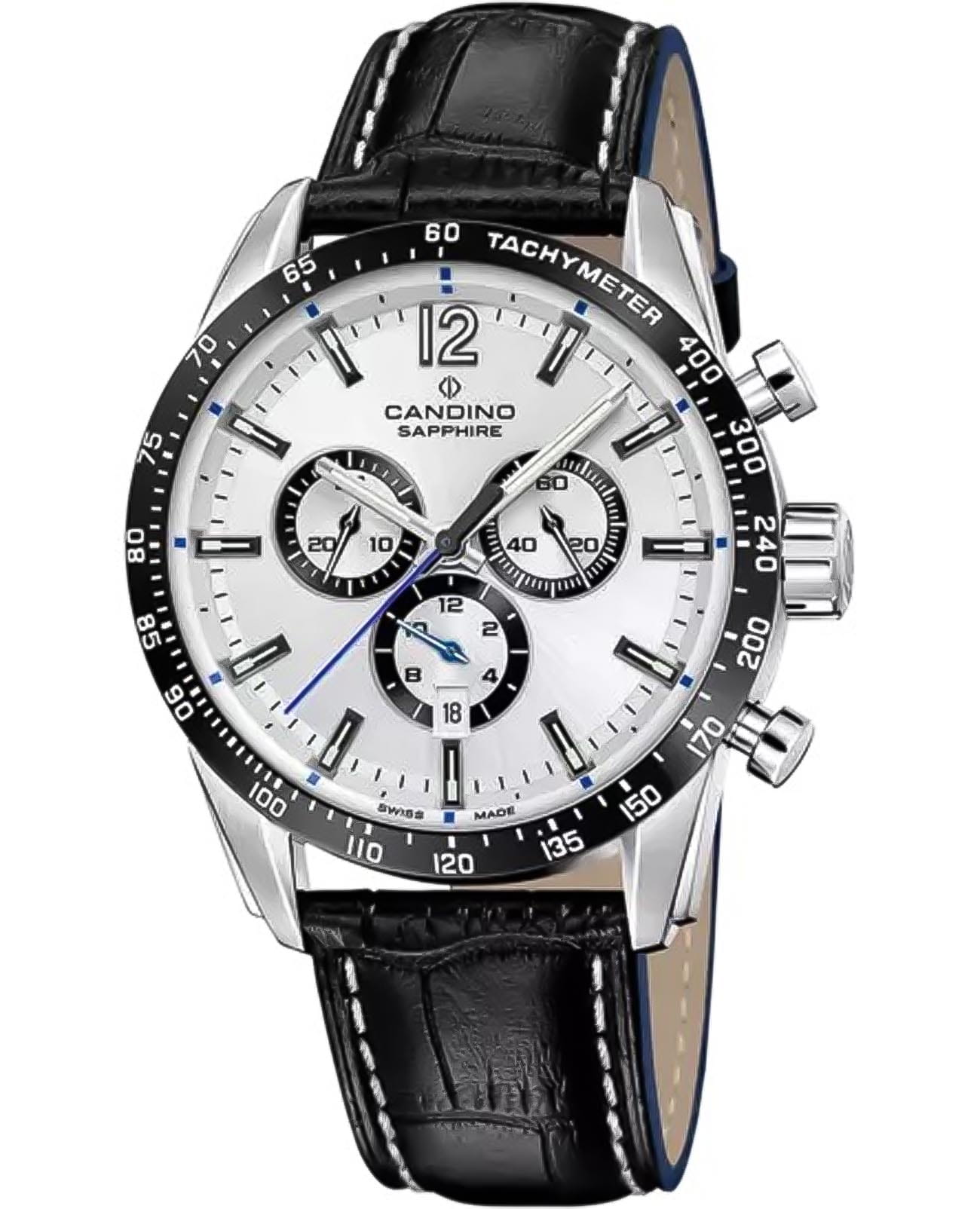 Швейцарские мужские наручные часы-хронографХронографФункция позволяет измерять отрезки времени с особой точностью: часы, минуты, секунды. Верным признаком хронографа является наличие на циферблате 3 дополнительных окошек-счётчиков. Candino Gents Sport C4758/1, кварцевый механизм с высокой точностью. Сапфировое стеклоСапфировое стеклоПрочный и надёжный материал из кристалла сапфира синтетического происхождения, характеризующийся особой твёрдостью и устойчивостью к царапинам и повреждениям. устойчивое к появлению царапин, обладающее высокой прозрачностью. Часы, минуты, секунды. Окошко даты находится в положении 6 часов. Класс водозащиты: 100 метров, позволит плавать, нырять и заниматься другими водными видами спорта. Корпус часов изготовлен из нержавеющей стали. Стрелки и метки с люминесцентным покрытиемЛюминесцентное покрытиеПозволяет считывать показания времени в темноте. Производители наносят на стрелки, часовые индексы, безель или поверхность циферблата светонакопительный состав, дающий холодное свечение.. Кожаный ремешок на стандартной застёжке. БезельБезельВнешний ободок, закрепляющий стекло. В спортивных часах так называется поворотное кольцо с делениями на циферблате, выполняет роль таймера – замеряет отрезки времени на шкале. Неподвижный безель – элемент декора. Однонаправленно вращающийся безель на дайверских часах позволяет фиксировать моменты погружения и выныривания на поверхность. с PVD-покрытиемPVDУльтратонкое покрытие наносится в технике вакуумного напыления, сочетает в себе нитрид титана особой прочности со слоем золота или оксида хрома. Несёт в себе декоративную или защитную функцию. со шкалой тахиметраТахиметрРазмеченная шкала, располагается на ободке или безеле часов. Тахиметр позволяет рассчитать скорость на определённом участке пути, расстояние измеряется в километрах или милях..