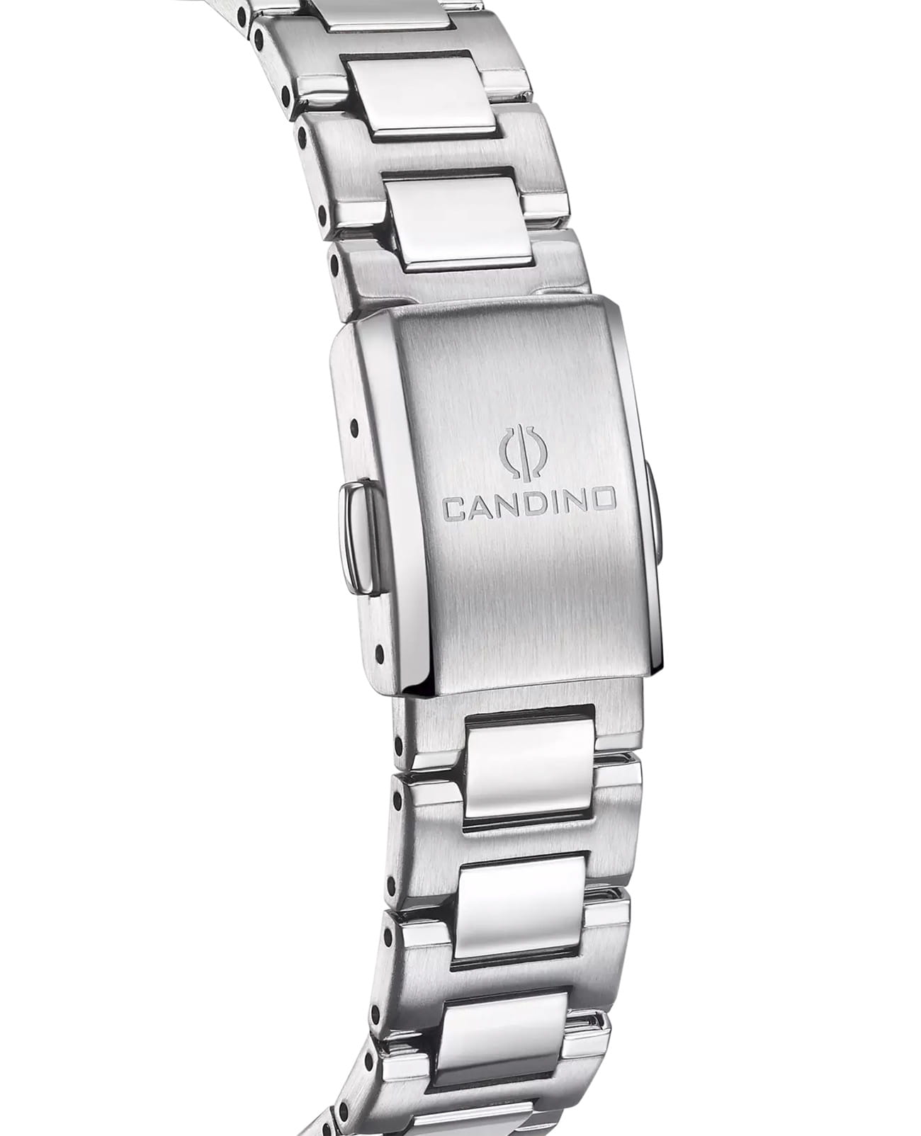 Женские кварцевые часы Candino — это сочетание элегантности и швейцарского качества. Корпус диаметром 34 мм и толщиной 8,25 мм выполнен из нержавеющей стали. Циферблат зелёного цвета оформлен индексами в виде штрихов и украшен циркониями, придающими изделию роскошный вид. Окошко даты расположено в положении 3 часов. Циферблат защищён сапфировым стекломСапфировое стеклоПрочный и надёжный материал из кристалла сапфира синтетического происхождения, характеризующийся особой твёрдостью и устойчивостью к царапинам и повреждениям., устойчивым к царапинам. Механизм — кварцевый произведённый в Швейцарии. Часы оснащены стальным браслетом с раскладной застёжкойРаскладная застёжкаТакой тип застёжки используется только на браслетах из металла. Она никогда не раскрывается полностью, происходит разделение на 2 и более частей. Раскладывающая застёжка снизит вероятность потери часов к минимуму.. Водонепроницаемость 50 м позволяет использовать часы в повседневных условиях. Гарантия — 2 года. Идеальный выбор для тех, кто ценит стиль, точность и надёжность.