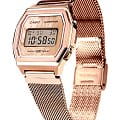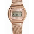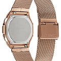 Уже известный 8-угольный ударопрочный корпусУдаропрочный корпусМеханизм заключён в корпус, выполненный из современных материалов, устойчивых к ударам, механическим повреждениям и падению с высоты: инновационный пластик, карбон, нержавеющая сталь, титан. выполнен из нержавеющей стали 316L, как и стильный браслет миланского плетения. Оригинально выглядит переливающаяся вставка, окружающая цифровое окошко. Кварцевый высокоточный механизм работает от батарейки, аккумулятор рассчитан на 3 года эксплуатации. Светодиодная подсветкаСветодиодная подсветкаСветодиодная или LED-подсветка обеспечивает появление яркого холодного свечения за счёт LED-элементов - маленьких лампочек. Они потребляют минимальное количество энергии, чаще всего можно встретить 1 светодиод, в нижней части циферблата. дисплея. Долговечное IP-покрытиеIP-покрытиеМетод ионного напыления. Демонстрирует повышенную устойчивость к истиранию, окислению и химическим веществам. Под воздействием высокого давления и температуры около 1500°C молекулы металла надёжно соединяются с частицами корпуса часов. цвета розового золота. Минеральное стекло устойчиво к появлению царапин. Автоматический календарь, будильник, секундомер. Габариты: 38 x 39,6 x 7,3 мм.