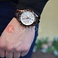 Оригинальный циферблат и чёрный безельБезельВнешний ободок, закрепляющий стекло. В спортивных часах так называется поворотное кольцо с делениями на циферблате, выполняет роль таймера – замеряет отрезки времени на шкале. Неподвижный безель – элемент декора. Однонаправленно вращающийся безель на дайверских часах позволяет фиксировать моменты погружения и выныривания на поверхность. превосходно сочетаются с золотистыми переливами ударопрочного корпусаУдаропрочный корпусМеханизм заключён в корпус, выполненный из современных материалов, устойчивых к ударам, механическим повреждениям и падению с высоты: инновационный пластик, карбон, нержавеющая сталь, титан. с защитным IP-покрытиемIP-покрытиеМетод ионного напыления. Демонстрирует повышенную устойчивость к истиранию, окислению и химическим веществам. Под воздействием высокого давления и температуры около 1500°C молекулы металла надёжно соединяются с частицами корпуса часов.. Приметный аксессуар отлично дополнит брендовый деловой костюм. Работу часов обеспечивает японский кварцевый калибр Miyota с точностью хода +/- 30 секунд в месяц. Батарейка характеризуется 3-летним сроком службы. Коричневый ремешок из натуральной кожи с тиснением под кожу крокодила. Люминесцентная подсветкаЛюминесцентное покрытиеПозволяет считывать показания времени в темноте. Производители наносят на стрелки, часовые индексы, безель или поверхность циферблата светонакопительный состав, дающий холодное свечение.. Закручивающаяся задняя крышка. Заводная головка с системой защиты. Закаленное минеральное стекло. Водонепроницаемость при давлении до 10 бар. ХронографХронографФункция позволяет измерять отрезки времени с особой точностью: часы, минуты, секунды. Верным признаком хронографа является наличие на циферблате 3 дополнительных окошек-счётчиков., секундомер, индикация числа. Габариты: 53 x 47 x 12,3 мм.