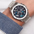 Наручные часы выполнены в спортивном стиле, тёмный циферблат, дополненный голубыми элементами, идеально гармонирует с серебристым отливом нержавеющей стали 316L. Брендовый кварцевый хронографХронографФункция позволяет измерять отрезки времени с особой точностью: часы, минуты, секунды. Верным признаком хронографа является наличие на циферблате 3 дополнительных окошек-счётчиков. получает питание от аккумулятора, срок службы которого составит 5 лет. Сапфировое стекло характеризуется повышенной устойчивостью к царапинам. Люминесцентная подсветка NeobriteЛюминесцентное покрытиеПозволяет считывать показания времени в темноте. Производители наносят на стрелки, часовые индексы, безель или поверхность циферблата светонакопительный состав, дающий холодное свечение.. Водонепроницаемость 100 метров. Функция секундомера, отображение даты. Габариты: 50,5 x 45,6 x 9,5 мм.