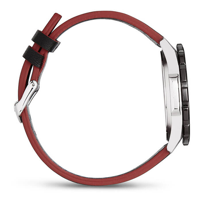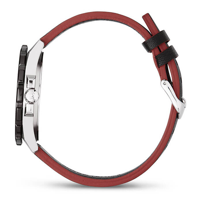 Это отличное решение для современных мужчин, стремящихся выглядеть стильно в любой ситуации. Чёрный циферблат с крупной индикацией времени дополнен яркими акцентами красного цвета, что придаёт общему дополнению динамичность. Прослеживается дайверский характер благодаря однонаправленно вращающемуся фактурному безелюБезельВнешний ободок, закрепляющий стекло. В спортивных часах так называется поворотное кольцо с делениями на циферблате, выполняет роль таймера – замеряет отрезки времени на шкале. Неподвижный безель – элемент декора. Однонаправленно вращающийся безель на дайверских часах позволяет фиксировать моменты погружения и выныривания на поверхность.. Ударопрочный корпусУдаропрочный корпусМеханизм заключён в корпус, выполненный из современных материалов, устойчивых к ударам, механическим повреждениям и падению с высоты: инновационный пластик, карбон, нержавеющая сталь, титан. сделан из стали 316L с противокоррозионными свойствами. Кварцевый японский механизм отличается точностью хода +/- 20 секунд в месяц. Срок службы батарейки - 3 года. Частичное IP-покрытиеIP-покрытиеМетод ионного напыления. Демонстрирует повышенную устойчивость к истиранию, окислению и химическим веществам. Под воздействием высокого давления и температуры около 1500°C молекулы металла надёжно соединяются с частицами корпуса часов.. Минеральное стекло. Оригинальный ремешок из натуральной кожи. Люминесцентная подсветка NeobriteПодсветка NeobriteИспользование светонакопительных составов на основе сульфида цинка или алюмината стронция, яркий свет можно наблюдать на протяжении 6-10 часов после «зарядки» часов около источника света.. Водостойкость 100 метров. Завинчивающаяся задняя крышка. Заводная головка с системой защиты. Отображение текущего числа. Габариты: 47,2 x 41 x 10,4 мм.